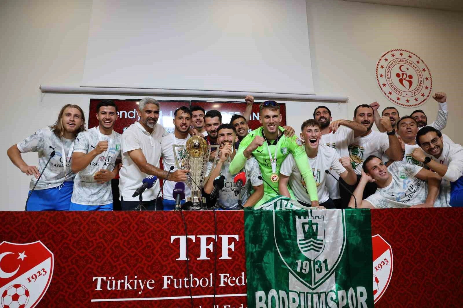 Bodrum FK futbolcuları kupa ile basın toplantısına girerek, Teknik Direktör İsmet Taşdemir’i ıslatıp Süper Lig’e yükselmelerini kutladı.