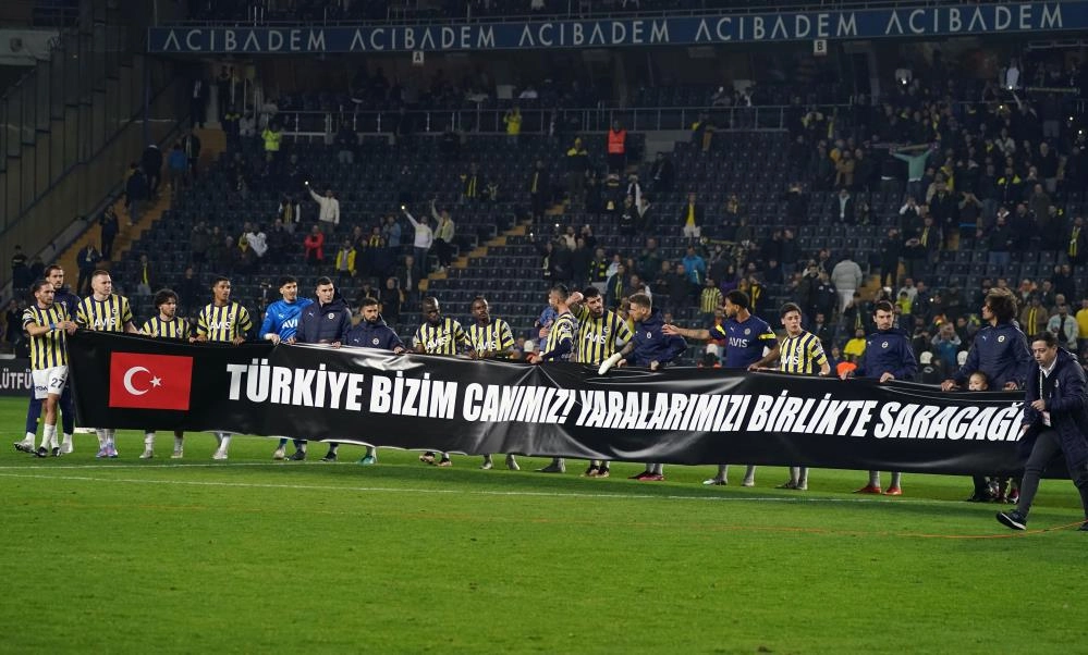 Fenerbahçeli futbolcular, Spor Toto Süper Lig 23. hafta erteleme maçında Konyaspor’u 4-0 mağlup etmesinin ardından anlamlı pankart ile depremzedelere destek verdi. Sarı-lacivertliler, müsabakanın bitiş düdüğüyle birlikte orta sahada toplanarak "Türkiye bizim canımız, yaralarımızı birlikte saracağız" yazılı pankart açtı. Pankartın açıldığı sırada stat hoparlöründen de Ayten Alpman’ın seslendirdiği "Memleketim" ile Mustafa Yıldızdoğan’ın seslendirdiği "Türkiyem" şarkısı çalındı. Ardından Fenerbahçeli futbolcular, sarı-lacivertli taraftarların alkışları eşliğinde soyunma odasına girdi.