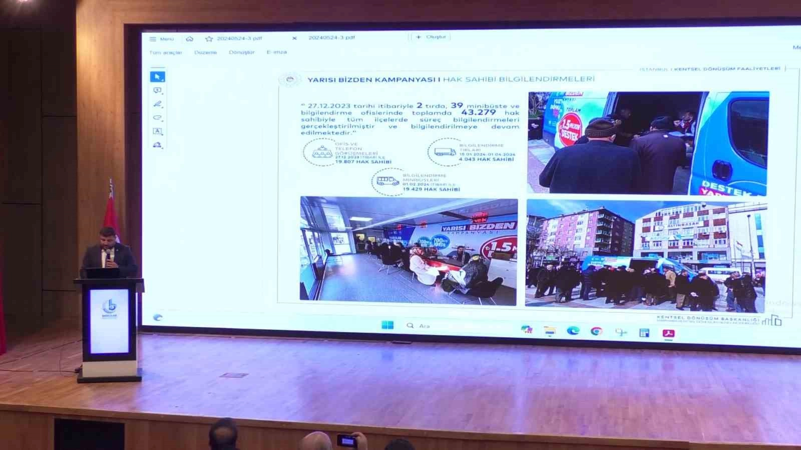 Programda konuşan Bağcılar Belediye Başkanı Abdullah Özdemir, “Bağcılarda özellikle inşaat uygulaması yapan müteahhit firmalara Bağcılar ve İstanbul’da ’Kentsel Dönüşümde Yarısı Bizden’ nasıl bir usul izlenmesi gerektiği konusunda bilgilendirmeler yapılıyor. Bağcılar Belediyesi olarak yoğun bir kentsel dönüşüm çalışması yürüten belediyeler olarak öncü belediyeyiz. En çok konut bazlı müracaat yapılan ilçeyiz. 6 Şubat depremi öncesi ve sonrası diye kentsel dönüşüm çalışmaları ikiye ayırıyorum. 6 Şubat öncesi çok farklı bakış açısı söz konusuydu. Vatandaşımız daire daire isterim, 1 metrekareden feragat etmem ağırlıkta tavrı söz konusuydu. 6 Şubat sonra bu işin fedakarlık yapılmadan olamayacağını ama vatandaşında süreç için de mutlaka 3’üncü bir sac ayağı olarak sürece maden, manen her anlamda katkı sunması kıymetliydi. 6 Şubat’tan sonra bu büyük oranda olması gereken düzeye ulaştı. Aslında kentsel dönüşüm her yerde şu anda yasalarımız hazır, imarda yüzde 70 kadar komşularıyla bir araya gelirseler imarlarını artırıyoruz. Devletimizin de 1,5 milyon liralık ’Kentsel Dönüşümde Yarısı Bizden’ kaynaklı katkısı söz konusu” dedi.