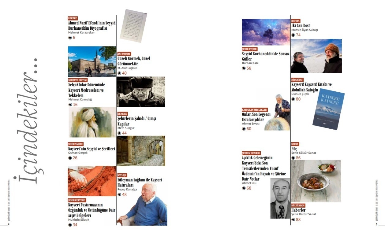Şehrin imar ve altyapı gibi ihtiyaçlarının yanı sıra sosyal ve gönül belediyeciliği anlamında da hizmetlerini aksatmadan sürdüren Kayseri Büyükşehir Belediyesi, Şehir Kültür Sanat Dergisi’nin 53’üncü sayısını okurlarıyla buluşturdu. Bugüne kadar Kayseri kültürü ve değerlerine ilişkin onlarca kitap yayımlayan, bunların yanı sıra yüzlerce de süreli yayına imza atan büyükşehir belediyesi, kültür sanat envanterinde bulunan ve 3 ayda bir yayımlanan Şehir Kültür Sanat Dergisi’nin 53’üncü sayısında 96 sayfalık dolu dolu konularla okuyucusunun karşısına çıktı. Büyükşehir Belediyesi’nin Kayseri’ye ilişkin önemli, ilginç ve değerli bilgileri okurlarına aktaran Şehir Kültür Sanat Dergisi, zengin içerik ile adeta kitap gibi dergi olma özelliğine devam ediyor. Yayın hayatına 53’üncü sayı ile devam eden dergi içeriğinde, ‘deneme, makale, söyleşi, inceleme, kültür, tarih’ gibi pek çok tür ve konuda bilgilere yer veriyor. Okurunun ilgiyle okuyacağı nitelikte olan Şehir Kültür Sanat Dergisi, şehri, hemen her yönü ile yansıtmaya çalışan yayın kurulu üyeleri, tarihi ve kültürel kaynaklardan derledikleri bilgiler ile meraklılarına adeta şehrin şifrelerini sunuyor. Derginin 53’üncü sayısında Kayseri Pastırması’nın özgünlük ve üstünlüğüne dair bilgilerin yanı sıra, gizli kalmış halk şairi Yusuf Özdemir’in şiirleri, Kayseri’nin seyyid ve şerifleri gibi şehir tarihine dair notlar ve bilgiler yer alıyor.