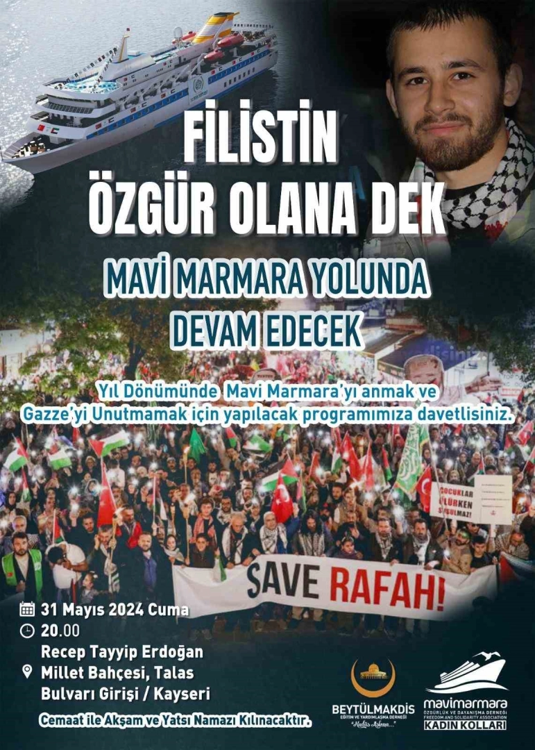 Beytül Makdis Derneği ve Mavi Marmara Kadın Kolları tarafından Kayseri Recep Tayyip Erdoğan Millet Bahçesi’nde 31 Mayıs Cuma akşamı, Mavi Marmara şehitlerini anmak üzere bir program düzenlenecek.