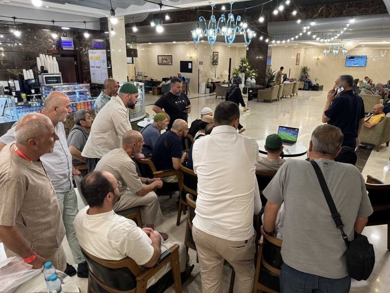 Suudi Arabistan’ın Medine-i Münevvere şehrinde bulunan yaklaşık 30 bin Türk hacı, Çekya ile oynanan maçı büyük bir heyecanla takip ettiler. Yatsı namazından 1 saat sonra ekran başına geçen hacılar, kaldıkları otellerin lobilerinde duygu yüklü dakikalar geçirdiler. Cep telefonu ve dizüstü bilgisayarlarından kafeteryada seyretmeye başladıkları maçın ilk golünde ise otel ayağa kalktı. Maç sonrasında ise oyun ile alakalı yorumlar otellerin zemin katlarını adeta stadyuma çevirdi.