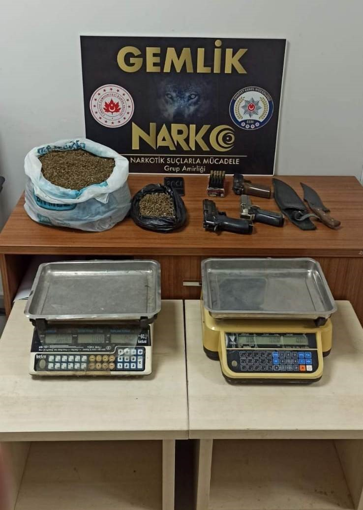 Gemlik İlçe Emniyet Müdürlüğü'ne bağlı ekipler uzun süredir takibe aldığı A.S. (43) isimli şüpheli şahsın alınan izinle birlikte arama yaptı. Yapılan aramada 2 kilo 15 gram esrar, 2 adet dijital terazi, 3 tane tabanca, 1 kasatura ve 20 adet mermi ele geçirdi.