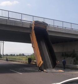 Bursa'nın İnegöl ilçesinde damperi açık kalan kamyon, üst geçide çarptı. Meydana gelen kazada çarpmanın etkisiyle kamyondan ayrılan damper üst geçitte sıkışıp kalırken, kamyon ise şarampole uçtu.