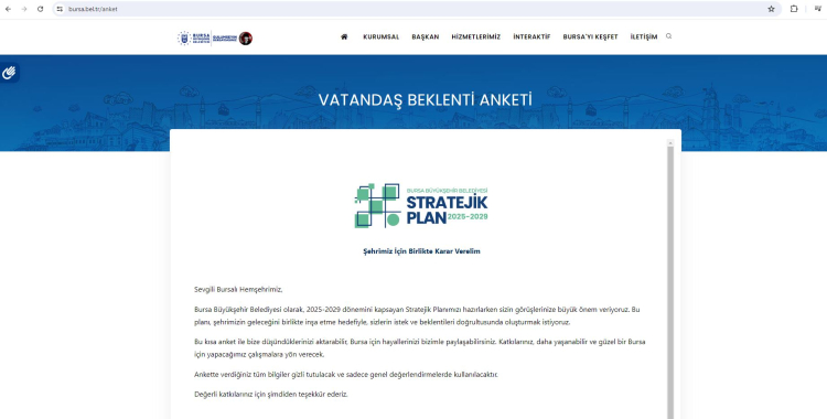 Bursa’nın yol haritasını belirleyecek olan ‘2025-2029 Stratejik Plan’ çalışmalarını Türkiye’ye örnek bir katılımcı anlayışla sürdüren Bursa Büyükşehir Belediyesi, “Kentin geleceğinde benim de görüşüm yer alsın” diyen vatandaşlar için www.bursa.bel.tr/anket adresi üzerinden başlattığı anket çalışmasını sürdürüyor.