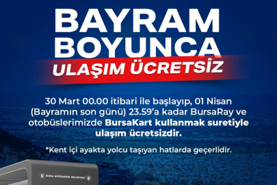 Bursa Büyükşehir Belediyesi, 30 Mart, 31 Mart ve 1 Nisan tarihlerini kapsayan Ramazan Bayramı boyunca kent içi toplu taşıma araçlarının ve Bursaray hatlarının ücretsiz olacağını açıkladı.