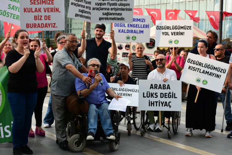 Kent Meydanı’ndan düzenlenen basın açıklamasında Engelliler Meclisi adına konuşan Ayhan Zenbilci, Maliye Bakanlığı’nın üzerinde çalıştığı vergi reformu paket taslağında ‘yoksul olduğunu belgeleyen’ engelli bireylerin Aile ve Sosyal Hizmetler Bakanlığı’na ‘araç alım desteği’ için başvuru yapabileceği ancak destekten faydalanacak olan bireylerin, engelli kaynaklı sosyal yardım desteklerinin kesileceği iddialarını hatırlattı. Kamuoyuna yansıyan bilgilerde iki ihtimal üzerinde durulduğunu belirten Zenbilci, “İlk ihtimal, istisnadan yararlanma süresinin 5 yıldan 10 yıla çıkarılması, taşıtların veraset yoluyla devredilmesiyle ilgili vergilerin mirasçılar tarafından ödenmesi ve her yıl yeniden değerleme oranında yükselen tutarın, bu oranın yarısı kadar arttırılması ihtimali. İkinci ihtimal de ÖTV Kanunu’ndaki istisnanın kaldırılması, teşvikin sosyal yardım şeklinde yapılması, engellilere getirilecek gelir şartı sunma zorunluluğu, satın alınacak taşıtların yerli olması ve bu esaslara bağlı olarak ilgili bakanlık tarafından araç alımında nakit desteği verileceği ihtimalidir” ifadelerini kullandı.
