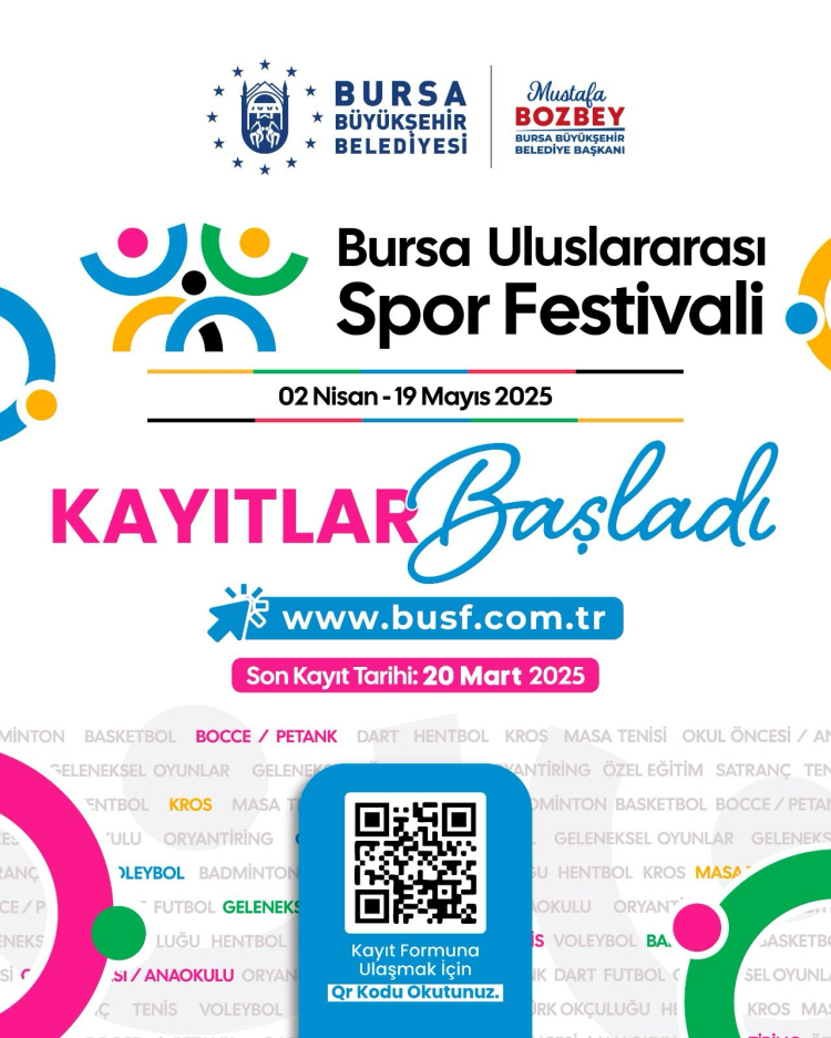 Birçok spor dalında kıyasıya rekabete sahne olacak festival için kayıtlar başladı. Organizasyona kayıt yaptırmak isteyenlerin 20 Mart tarihine kadar www.busf.com.tr adresine girerek veya Büyükşehir Belediyesi’nin web sitesinde yer alan QR kodu okutarak başvurularını tamamlamaları yeterli olacaktır.