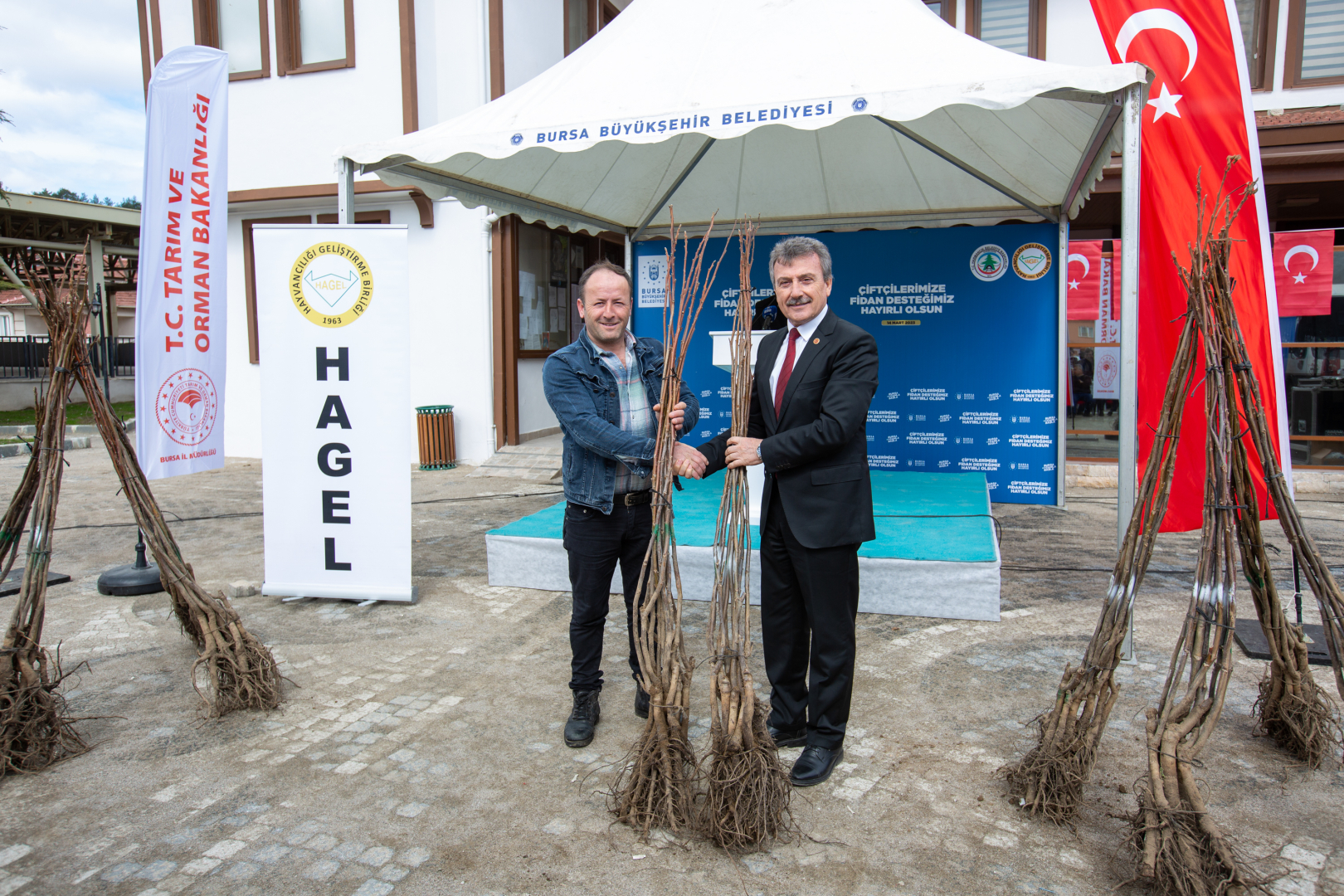 Harmancık Belediye Başkanı Yılmaz Ataş ile İl Tarım ve Orman Müdürü Hamit Aygül, tarımsal üretime katkıları nedeniyle Bursa Büyükşehir Belediyesi ve Hagel’e teşekkür etti.