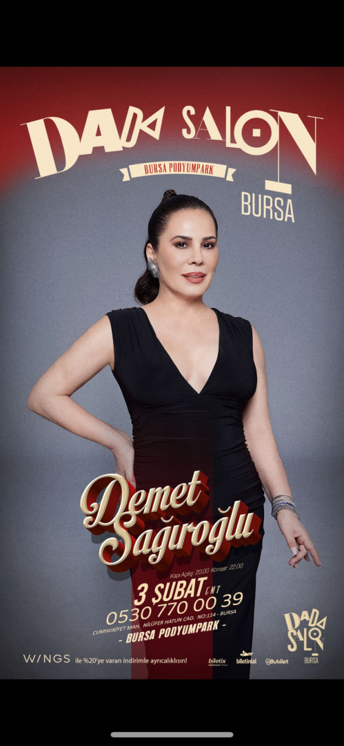 Türk popunun unutulmazları arasına girmiş ve 1994’te aranjörlüğünü Uzay Heparı'nın, prodüktörlüğünü Şehrazat'ın yaptığı Kınalı Bebek ile 90’lı yıllardan bu yana hayatımızda olan “Arnavut Kaldırımı”, “Papatya Falları”, “Şikayetim Var” “İhanet Ettin” gibi hit şarkılarıyla dinleyicilerin gönlünde taht kuran Demet Sağıroğlu, 3 Şubat’ta Dada Salon Bursa’da dinleyicilerle buluşacak.