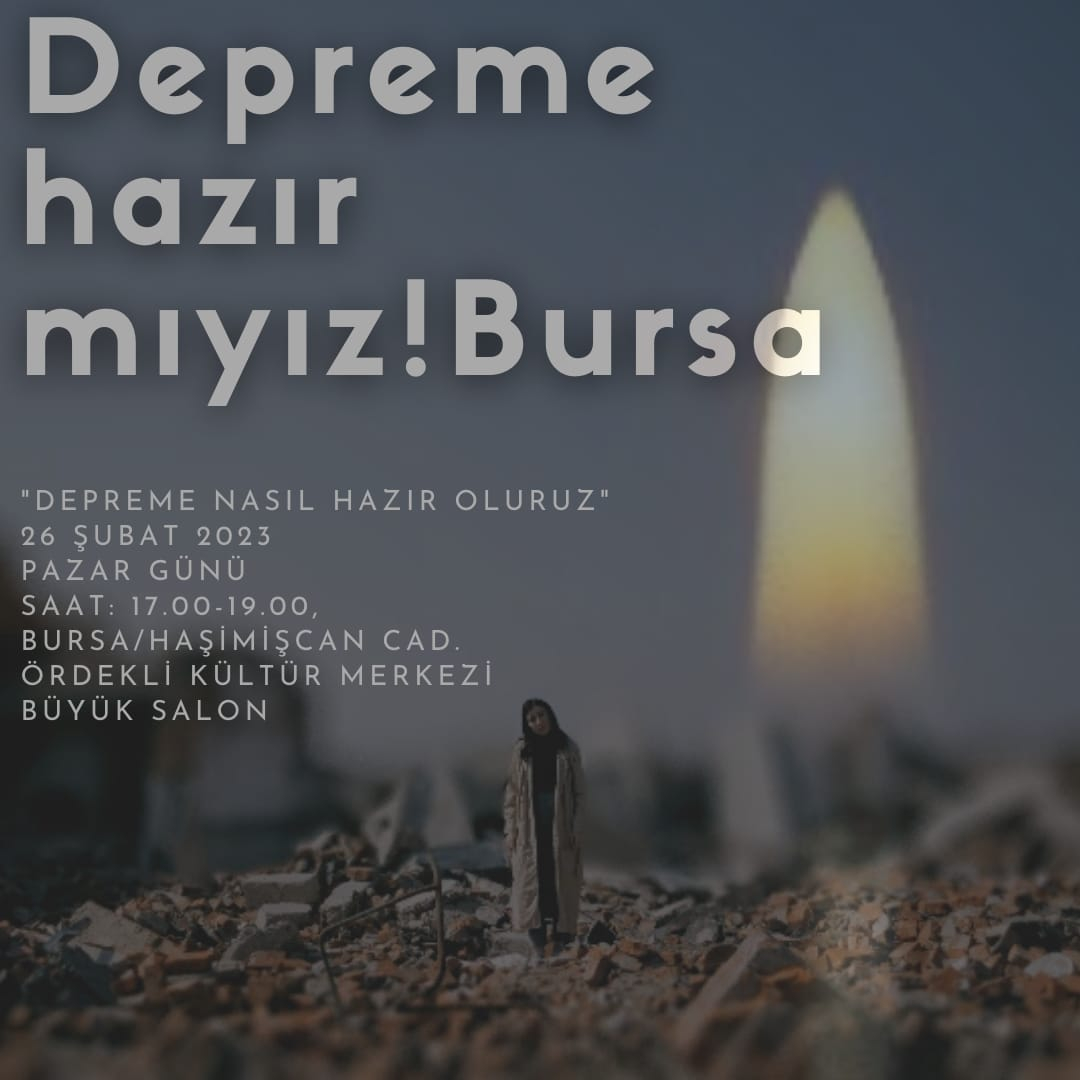 Günümüzün en somut gerçeği deprem. Adım adım yaklaşmakta olan Marmara odaklı bir depreme ise Bursa’nın ne kadar hazır olduğu sorgulanıyor. Depreme olan hazırlığı ise bir gurup seminer vererek Bursa’yı bilinçlendirmek istiyor. Bursa’nın tanınan hukukçularından olan Av. Cüneyt Bülent Şeker’in deprem sonrası yaşanabilecek yapı kayıplarındaki hukuksal mevzuatları anlatacağı, hayatta kalma uzmanı eğitmen ve eski asker Ertan Özkan, arama kurtarma uzmanı Coşkun Yalıntaş deprem gerçeğini 26 şubat pazar günü saat 17,00-19,00 da Ördekli Kültür Merkezi’nde masaya yatıracak.