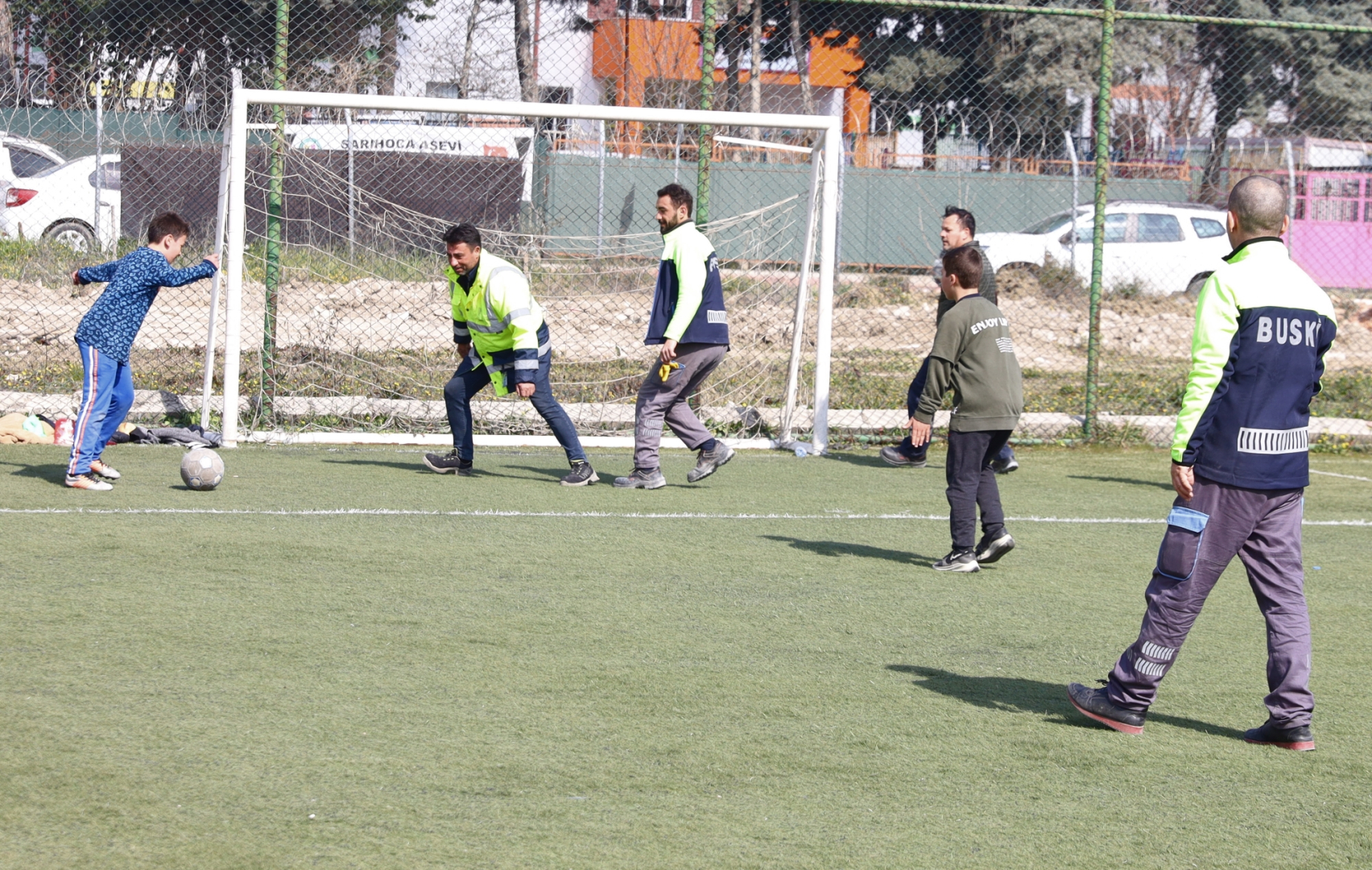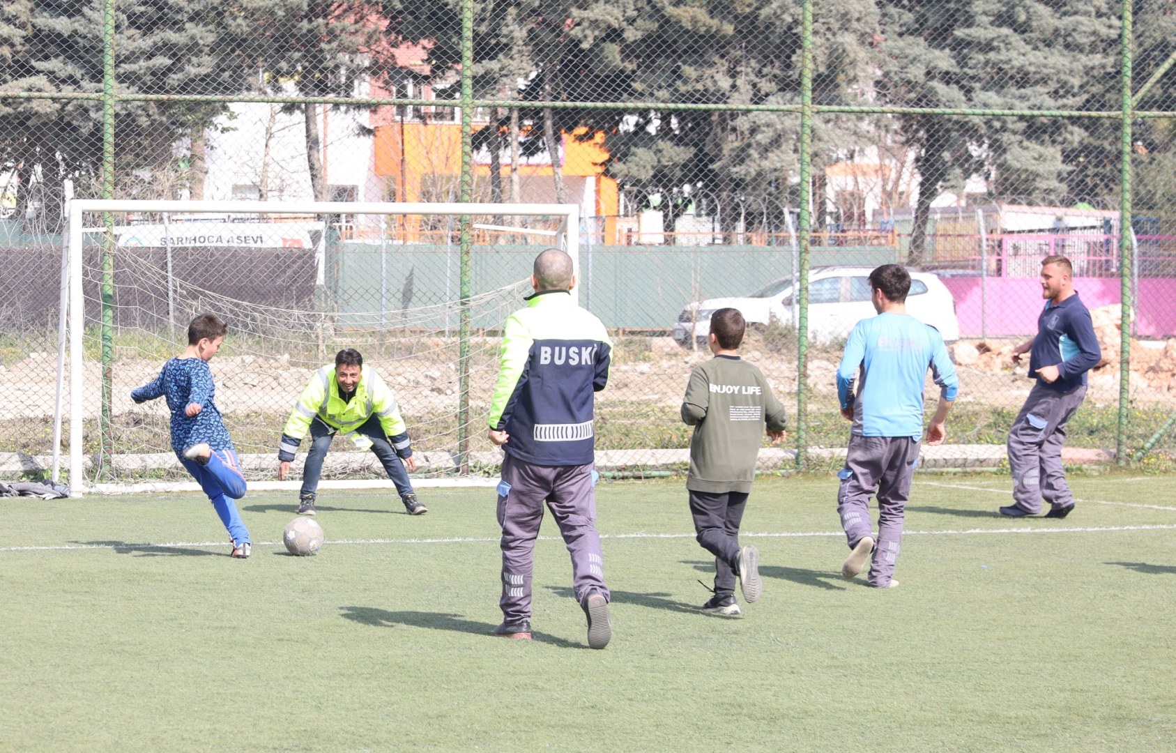 Özellikle kurulacak konteyner kent ve seyyar tuvaletler için altyapı çalışmalarını yürüten BUSKİ ekipleri, eski cezaevi alanında oluşturduğu şantiye alanında bulunan halı sahada depremzede çocuklarla futbol oynadı. Akranlarının ‘depremin ardından’ başka illere gitmesiyle yalnız kalan 3 arkadaş, halı sahanın yanındaki şantiyeye gelip BUSKİ çalışanları ile maç yapmak istedi. Çocukların isteği kırmayan ekipler, öğle paydosu için sözleşti ve daha sonra çocuklar için sahaya indi. Hem çalışanlar hem de çocuklar için keyifli geçen maçın ardından, BUSKİ Genel Müdür Yardımcısı Mesut Boz tarafından depremzede çocuklara çeşitli hediyeler verildi.