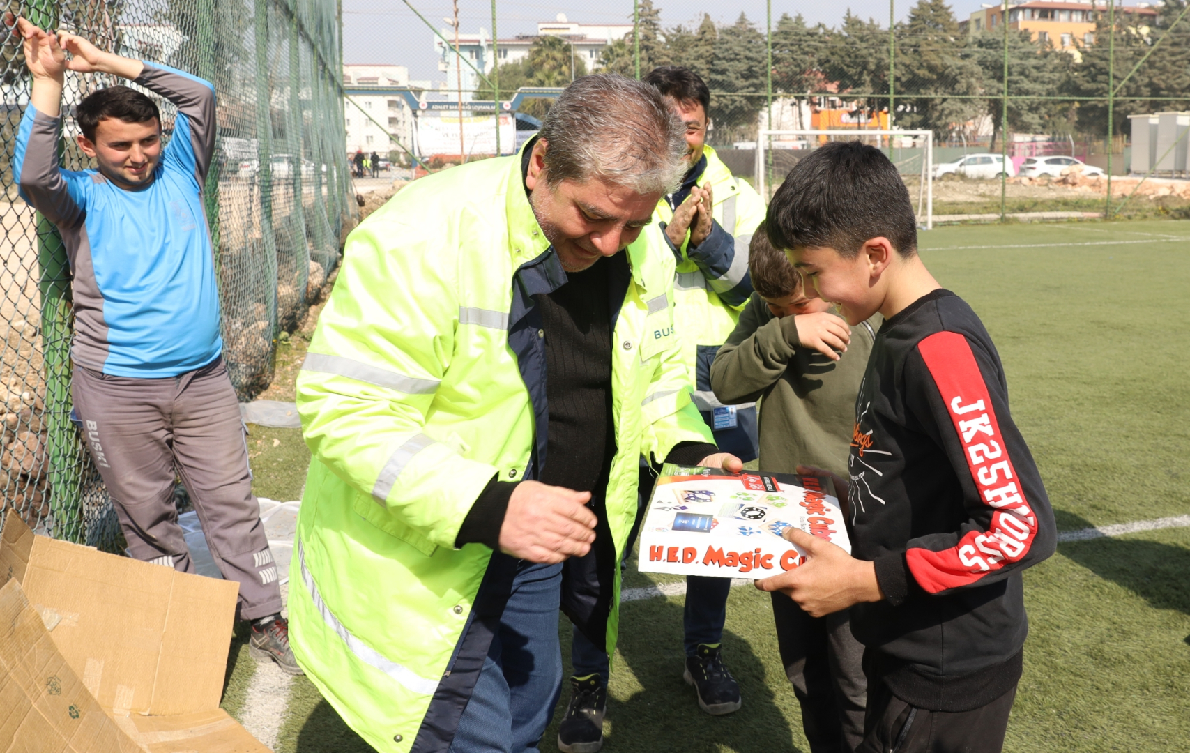Hatay’da yaraların sarılması için yoğun mesai harcayan Bursa Büyükşehir Belediyesi BUSKİ ekipleri, hem alt yapıyı hem de moralleri onarıyor. Akranları başka şehirlere gittiği için yalnız kalan 3 arkadaş, BUSKİ personeline maç teklif etti. Öğle paydosunda gerçekleştirilen mücadele ile keyifli anlar yaşayan çocuklar, maçın ardından çeşitli hediyelerle ödüllendirildi.