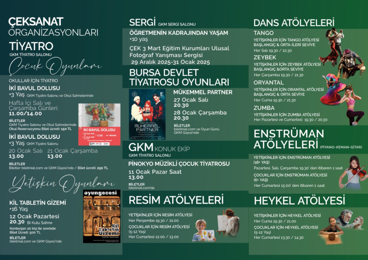 Ocak ayında ÇEKSANAT Görükle Kültür Merkezi’nde tiyatro, söyleşi, sergi, atölye çalışmaları ve çok daha fazlası sizleri bekliyor.