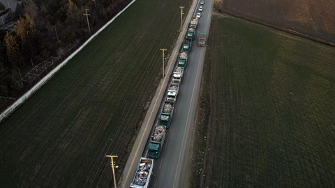 Kamyonların enkazı boşalttıkları alana giderken oluşturduğu metrelerce kuyruk, dron ile havadan görüntülendi.