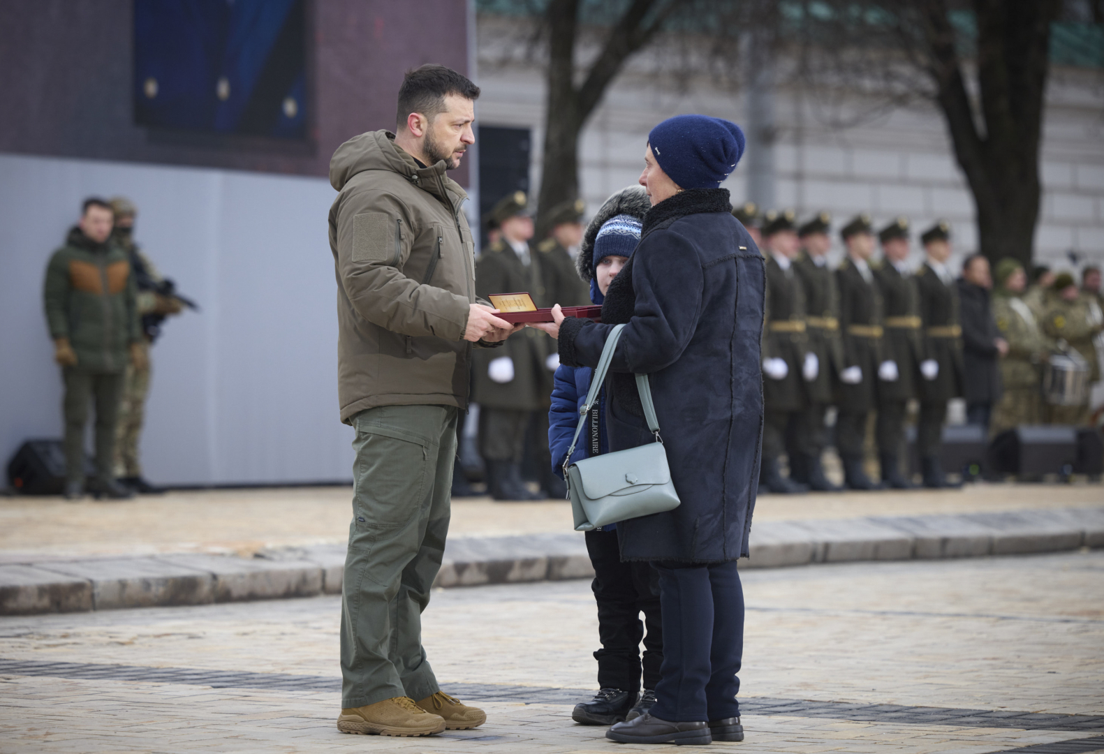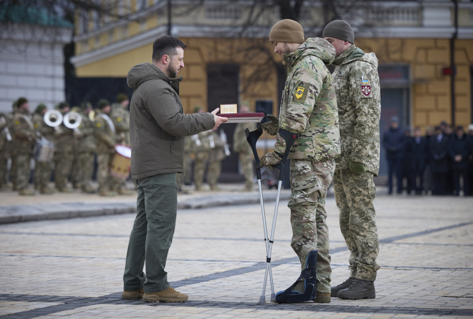 Ukrayna Devlet Başkanı Vladimir Zelenskiy, Rusya-Ukrayna savaşının 1. yıl dönümünde başkent Kiev’de gerçekleştirilen törende Ukrayna askerlerini devlet nişanıyla ödüllendirdi.