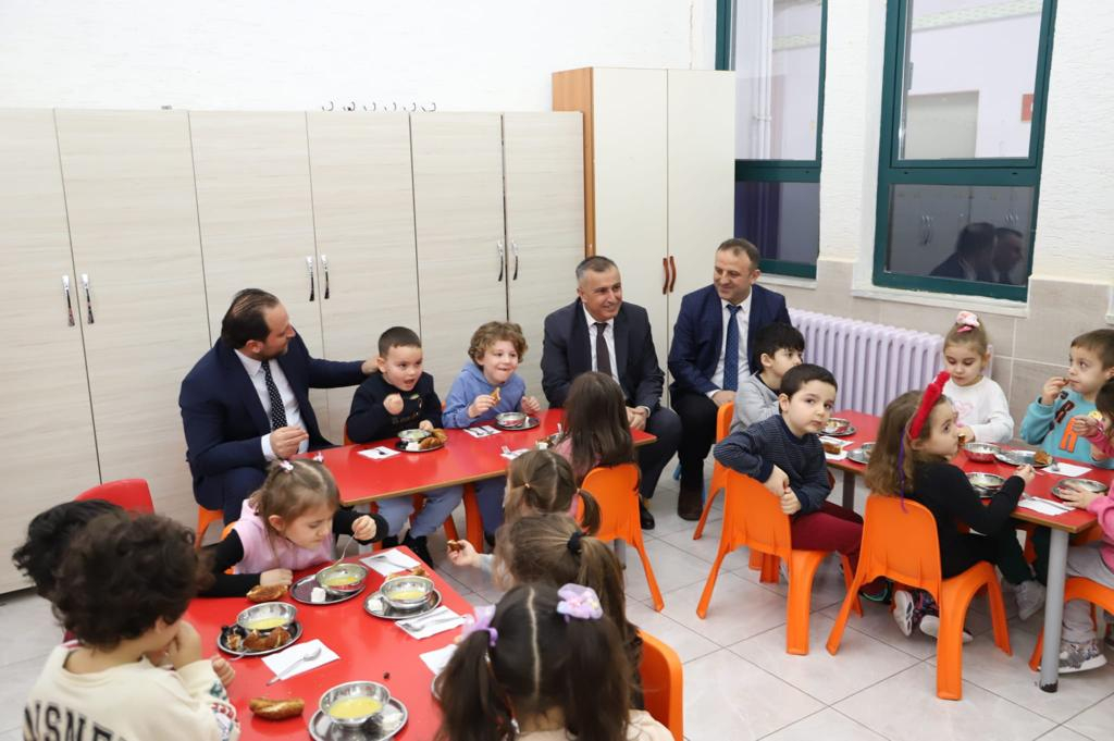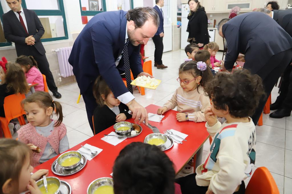 Milli Eğitim Bakanlığınca tüm anasınıfı öğrencilerine yönelik başlatılan ücretsiz yemek uygulaması kapsamında Şehit Jandarma Er Bahadır Aydın Ortaokulu’nun anasınıfındaki çalışmaları yerinde inceleyen İl Millî Eğitim Müdürü Serkan Gür, okuldaki minik öğrencilerin öğle yemeğine katıldı. Öğrencilere kendi elleriyle servis de yapan Gür ve beraberindekiler, öğrencilerin mutluluğuna ortak oldu.