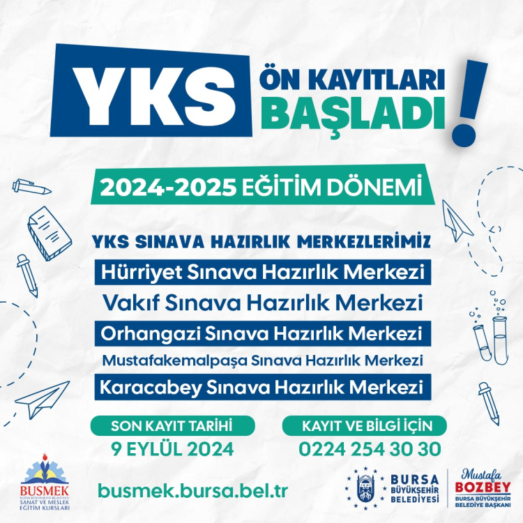 BUSMEK’in ücretsiz YKS hazırlık kurslarından yararlanmak isteyen gençler, 19 Ağustos-9 Eylül tarihleri arasında busmek.bursa.bel.tr internet adresinden başvuru yapabilecek.