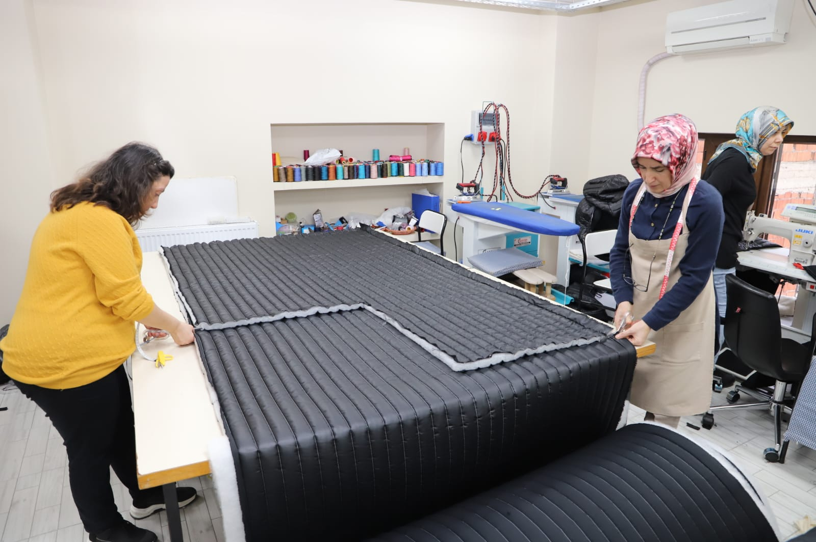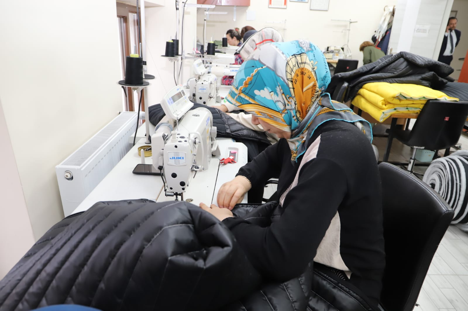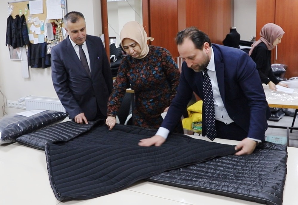 Bursa Olgunlaşma Enstitüsünde çalışan usta öğretici ve kursiyerler, depremden etkilenen vatandaşlar için kıyafet, battaniye gibi ihtiyaç malzemeleriyle başladıkları üretimi uyku tulumuyla sürdürüyor.