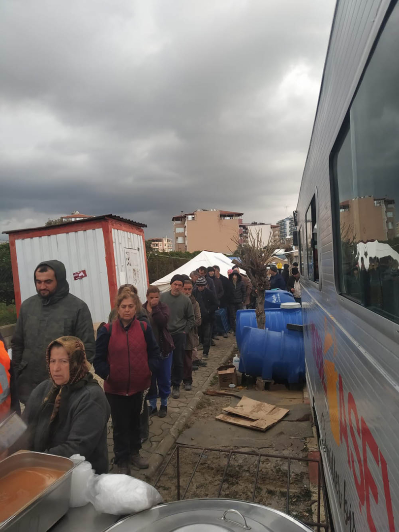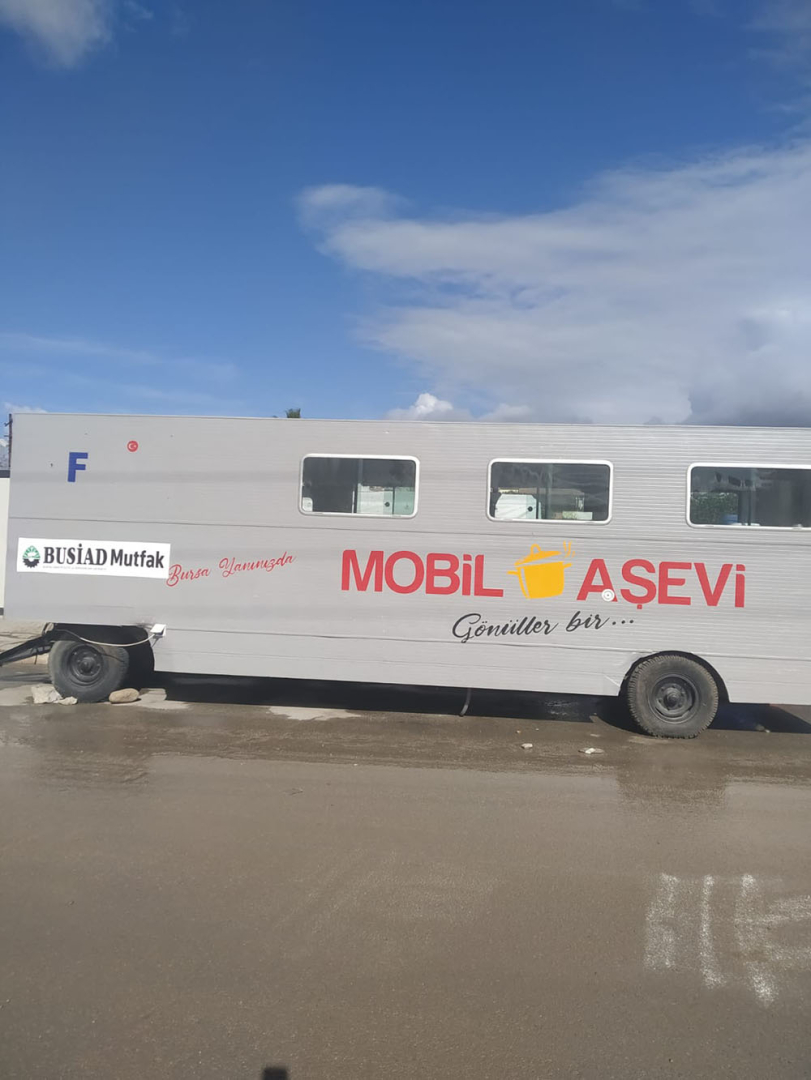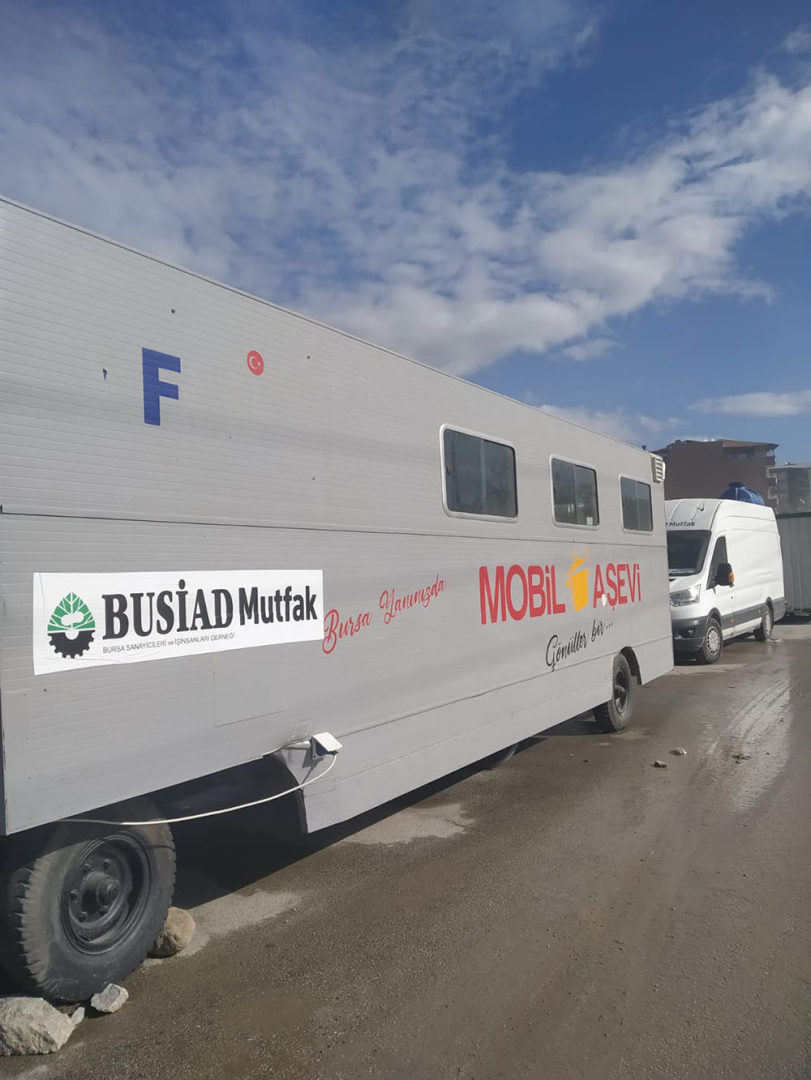 Depremin ilk gününden itibaren, üyeleriyle AFAD arasında koordinasyon sağlayan ve bölgeye iş makinesi ve konteynerlerin ulaşması için lojistik desteğin yanı sıra, yiyecek, su, giyim, soba, hijyen malzeme, sahra tuvaleti gibi ihtiyaçları üyeleri nezdinde karşılayan Bursa Sanayicileri ve İşinsanları Derneği (BUSİAD), şimdi de Hatay'ın Samandağ ilçesinde kurulan sahra mutfağında sıcak yemek ihtiyacını gideriyor.