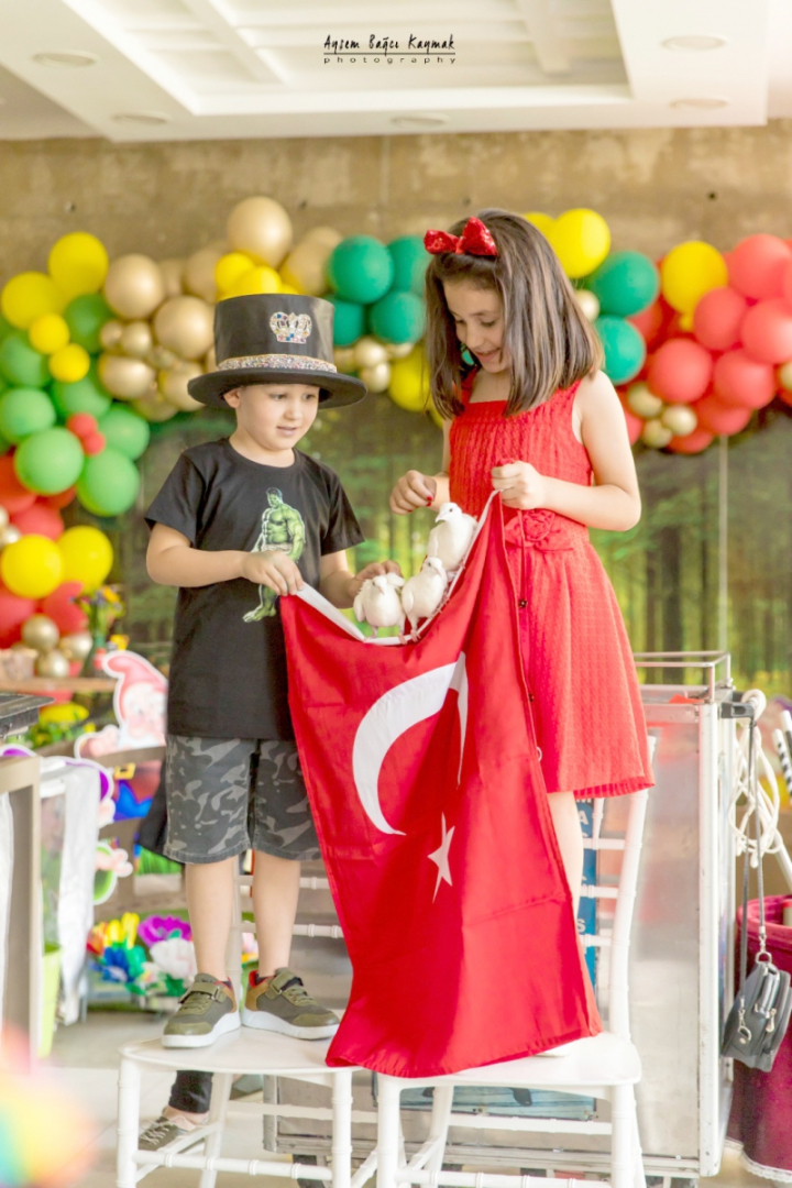 Doğum günü kardeşleri Arya ve Acar Şahin sihirbaz gösterisine katılım Türk bayrağı ile poz verdiler.
