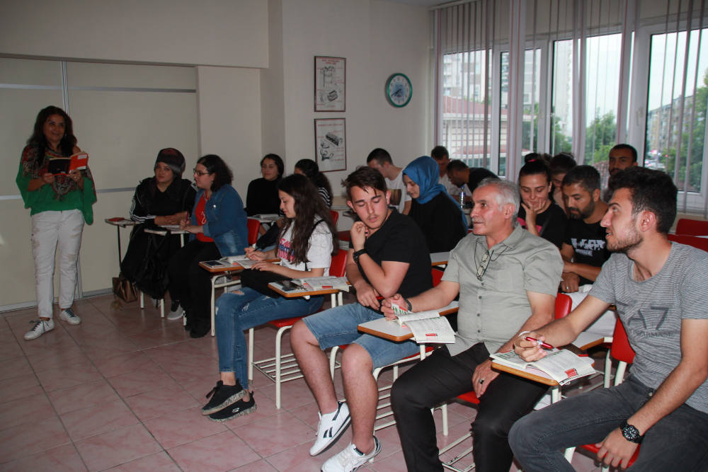 Türkan Polat, kurs merkezinde yeni sürücü adaylarına eğitimler veriyor.