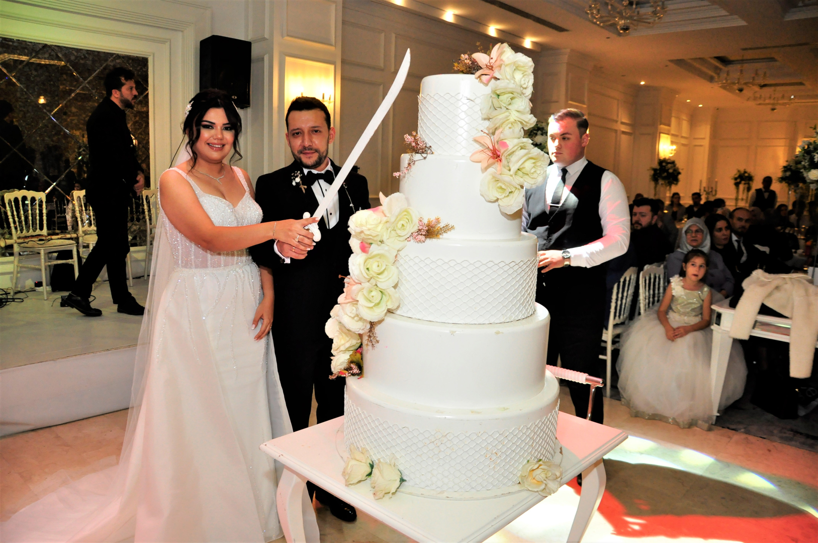 Genç çift alkışlar arasında düğün pastasını kesti.