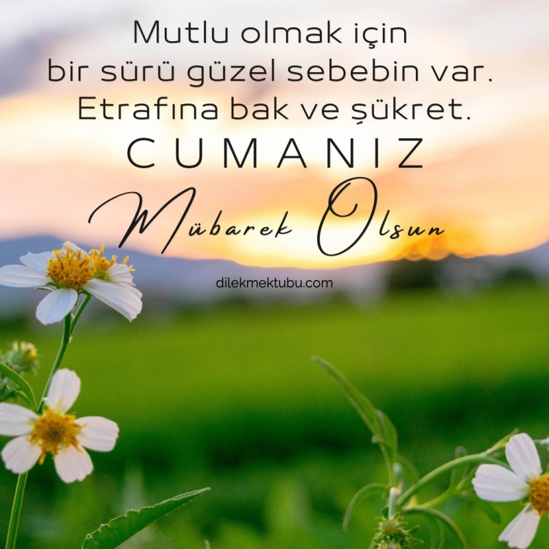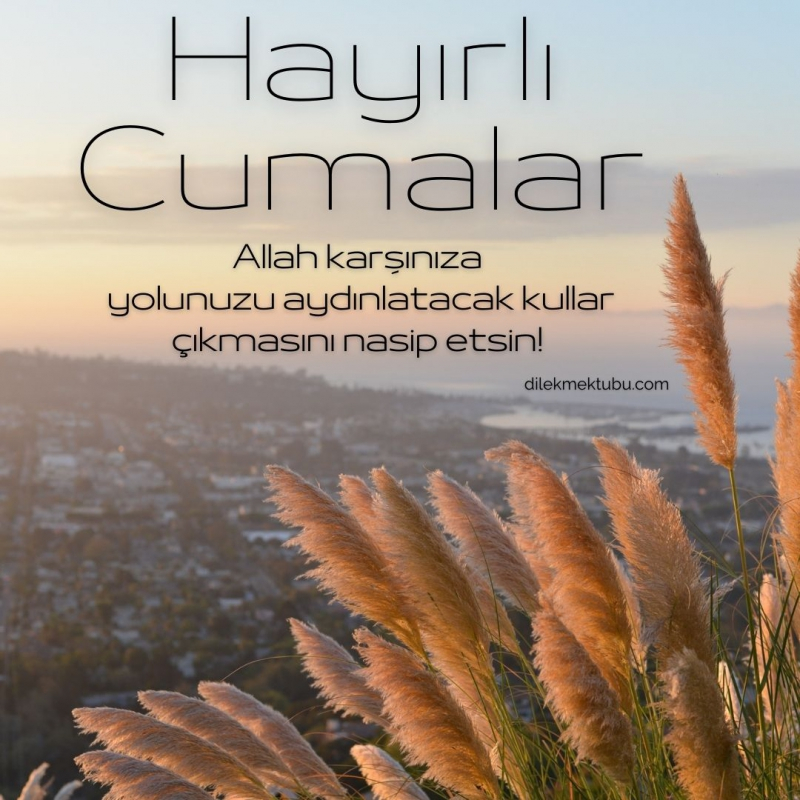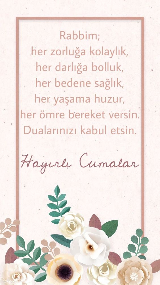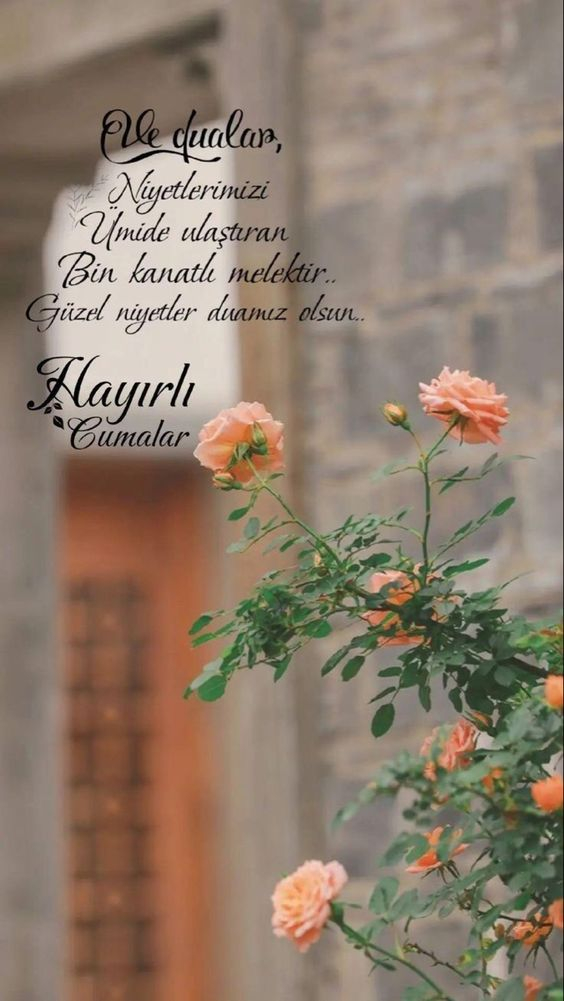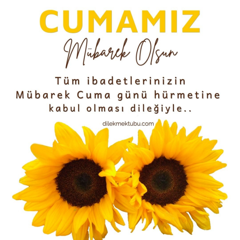 Cennet bahçelerinin gülleri yüzünüze, bülbüllerin nameleri dilinize, Allah'ın sevgisi gönlünüze ve bu güzel günün bereketi üzerinize olsun. Dünyada bir olan sende bin olsun, kainatta damla olan sende okyanus olsun. El açıp dua etiğin her şey bugün kabul olsun, amin! "Hayırlı Cumalar" dilerim. Bizi yoktan var eden, varlığından haberdar eden, yaratıp imtihan eden, imtihan edip sabır veren Allah'ın müminlerini bağışlaması dileğiyle "Allah'ım! Dillere destan, yüreklere ferahlık olan merhametin ile günahlarımızı affeyle. Amin tüm Müslümanların cuması mübarek olsun. Hayırlı, bereketli, huzurlu ve sağlık dolu günler dilerim. "