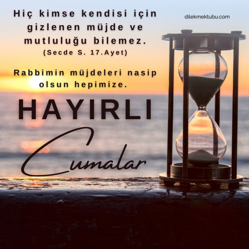 Ömrüne ömür katılsın, Gönlüne meltem saçılsın. Bu mübarek günde melekler dört yanını sarsın…Derdine derman, gönlüne iman dolsun..! Hayırlı Cumalar. Allah`ım! Akşama ulaştığımız gibi sabaha, sabah ulaştığımız gibi de akşama ulaşmayı nasip eyle. Sağlımızı koru ve hastalara şifa ver. Hayırlı bereketli cumalar dilerim. Cuma gününde bir saat vardır ki Müslüman, bu saate isabet ederek hayırlı bir şey isterse Allah ona istediğini verir. (Müslim, Cuma, 15) Hayırlı Cumalar. “Kalbinde kafasında hafızasında hiçbir ayet bulunmayan kimse harab olmuş bir ev gibidir.” (Tirmizi, Fezailül Kur’an 18) Hayırlı Cumalar… Kalpler imanla, gönüller huzurla dolsun saadetler hepimizin olsun ne kurulan bağlar bozulsun, nede dostlar unutulsun Cumanız Mübarek Olsun.