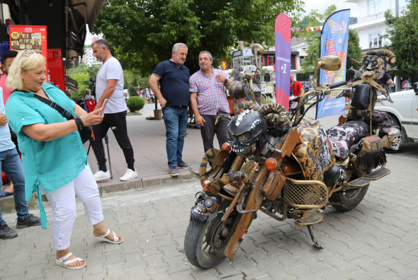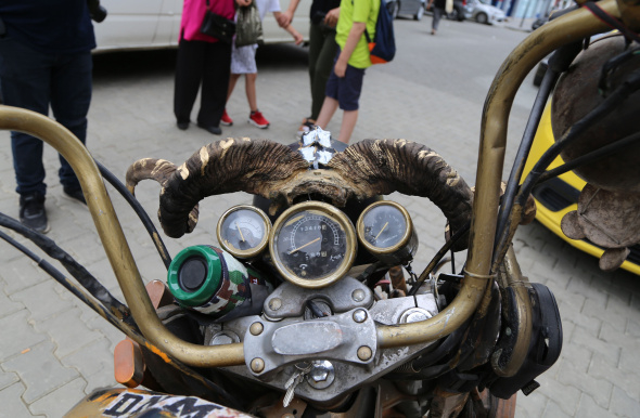 Koç boynuzu, kuru kafa gibi aksesuar ve hurda malzemelerle yaptığı motosiklet görenlerin ilgisini çekerken, yöre halkı ilginç motosiklet ile fotoğraf çektiriyorlar.