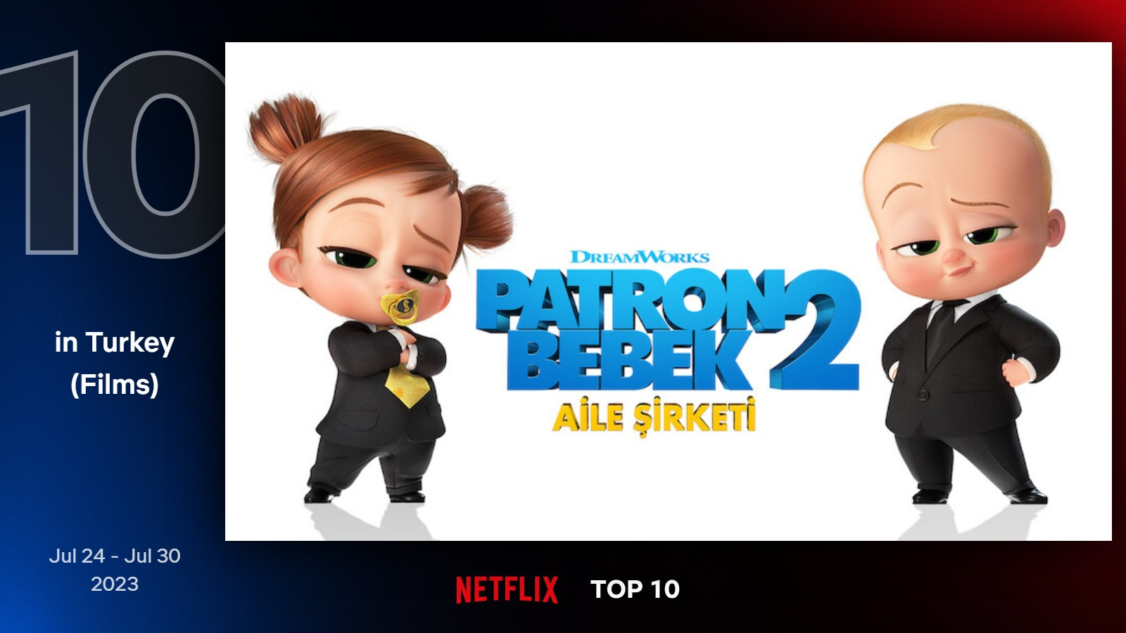 10. PATRON BEBEK 2: AİLE ŞİRKETİ Listedeki 2. haftasında sert bir düşüşle 4. sıradan 10. sıraya gerileyen film, Ted ve Tim kardeşlerin kötü bir karakterin planlarını bozmak için harekete geçmesini ve bunun için bir aile takımı kurmalarını konu alıyor.