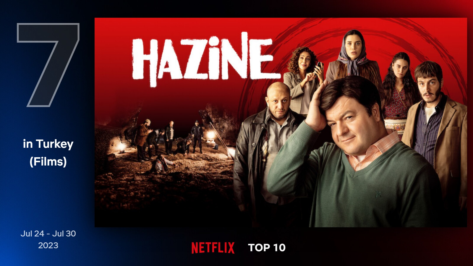 7. HAZİNE Listede sert bir düşüşle 3. sıradan 7. sıraya gerileyen komedi türündeki film, annesinin cenazesi için doğup büyüdüğü kasabaya geri dönen Mesut’un erkek kardeşinin zoruyla bir define kazısına katılmasını ve başına gelen belaları konu alıyor. Filmin başrollerinde ise Çağlar Çorumlu, Boran Kuzum, Şükran Ovalı ve Serkan Keskin gibi isimler bulunuyor.