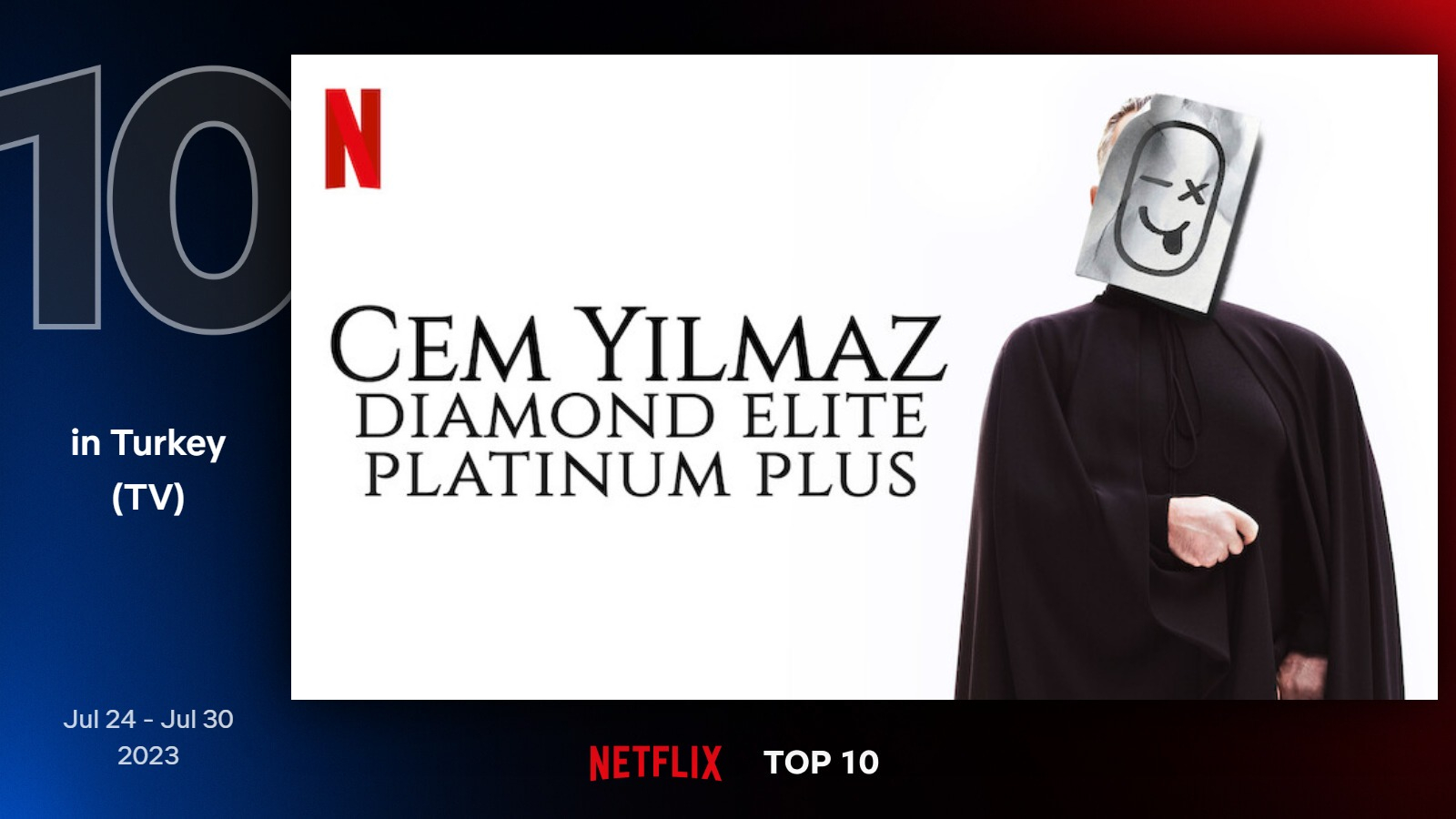 10. CEM YILMAZ: DIAMOND ELITE PLATINUM PLUS Ünlü komedyen Cem Yılmaz’ın stand up gösterini Diamond Elite Platinum Plus, Netflix listelerindeki 9. haftasında 10. sıraya geriliyor.