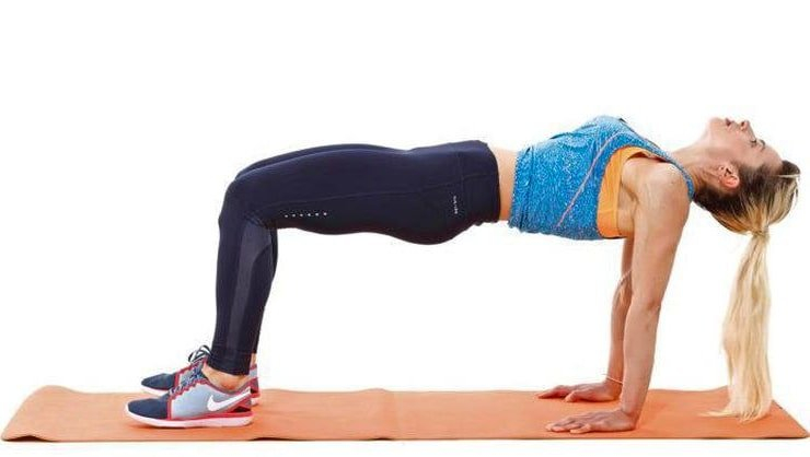 Sırt üstü uzanın ve dizlerinizi bükün. Ayaklarınızın zemine sağlam bastığından emin olun, bu arada kollarınızı iki yana uzatın. Yavaşça kalçanızı yerden kaldırın. Bedeniniz, dizlerinizden omzunuza doğru düz bir hat oluşturacak şekilde kalçanızı yükseltmeniz önemli. Karın ve kalça kaslarınızı sıkın ve 5 saniye kadar bu pozisyonda kalın. Sonra kalçanızı yavaşça zemine indirin.