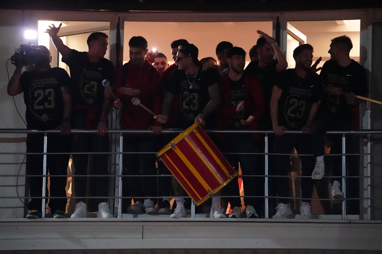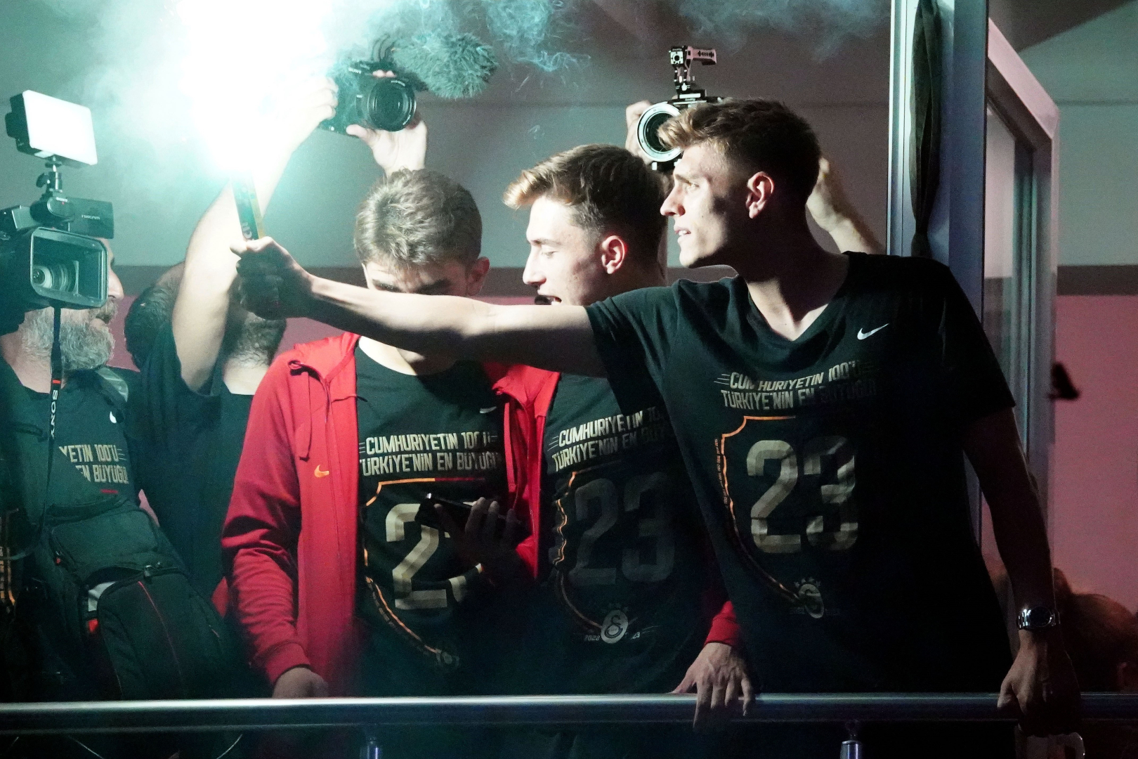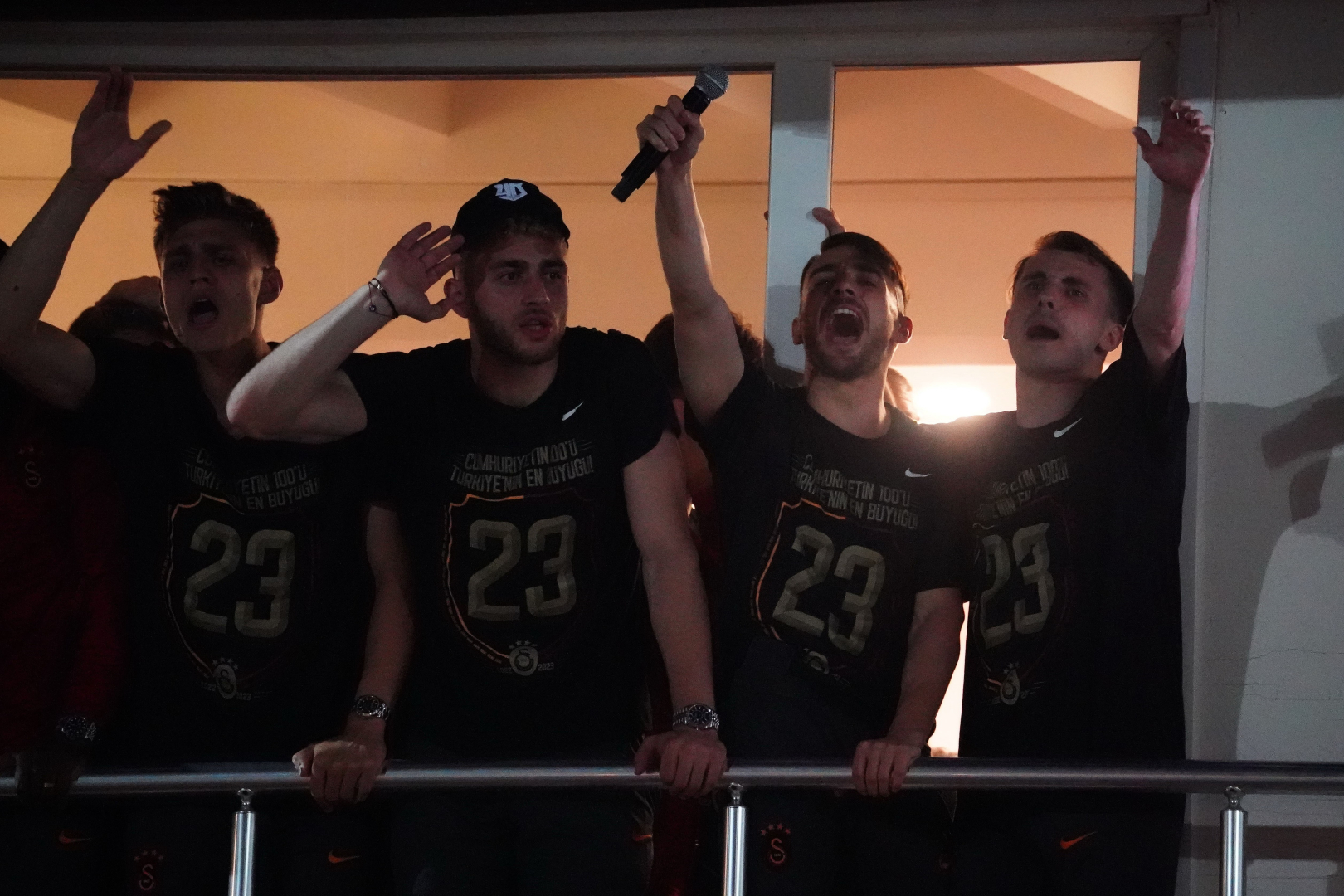 Futbolcular, teknik ekip ve yönetim kurulu üyeleri, şarkılar ve marşlarla 23. Süper Lig şampiyonluğunu sarı-kırmızılı taraftarlarla doyasıya kutladı.