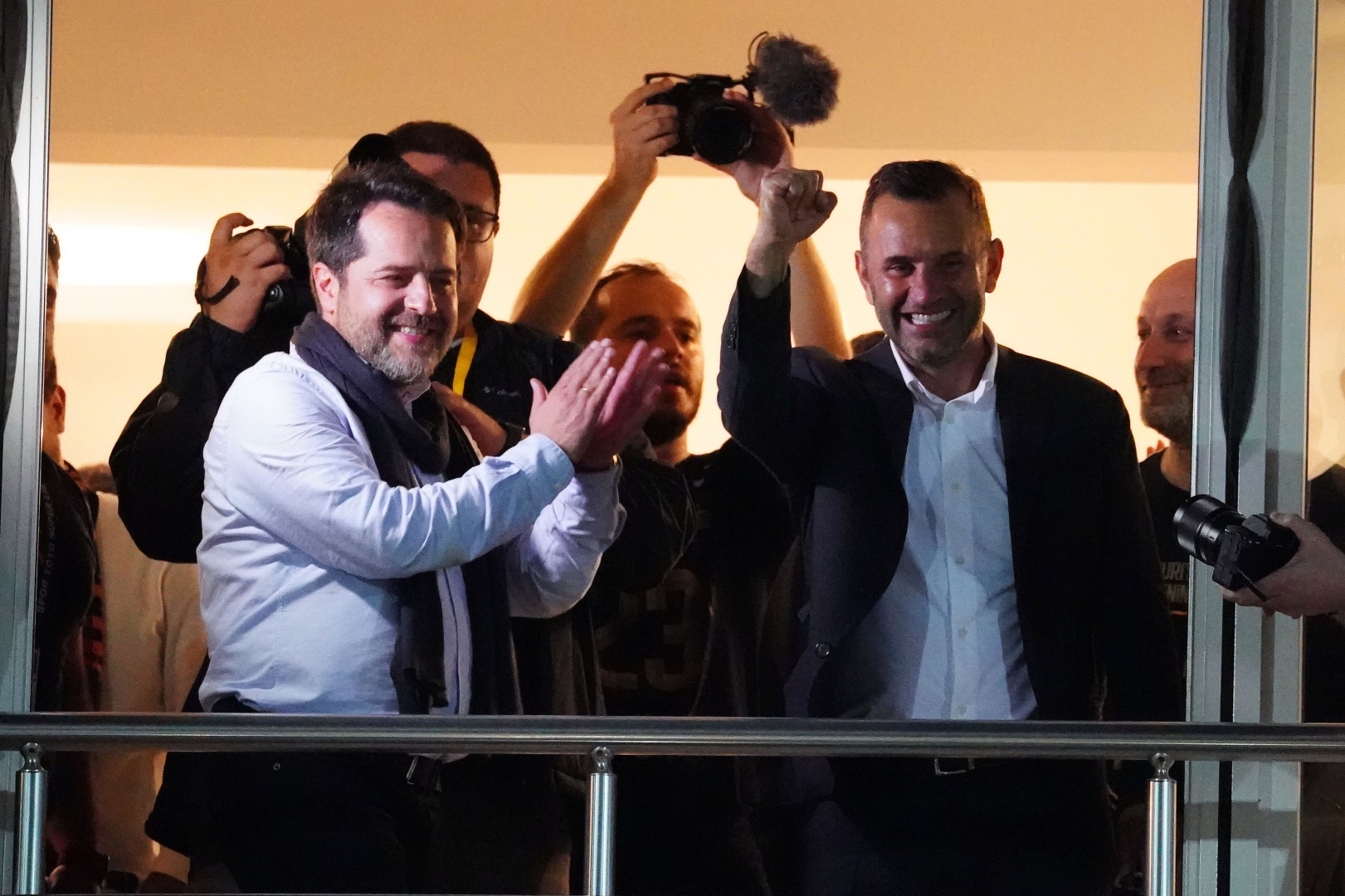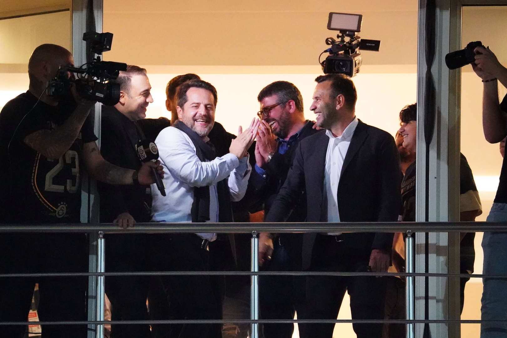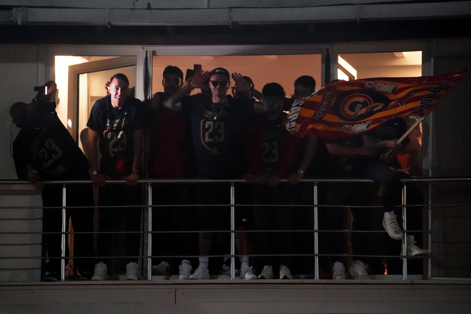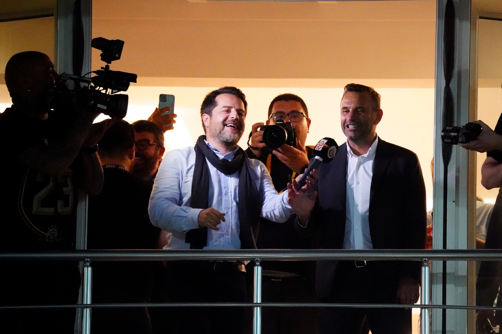 Futbolcular, teknik ekip ve yönetim kurulu üyeleri, şarkılar ve marşlarla 23. Süper Lig şampiyonluğunu sarı-kırmızılı taraftarlarla doyasıya kutladı.