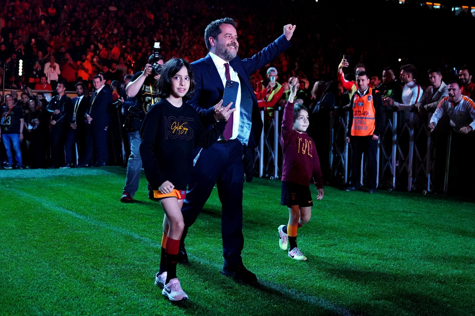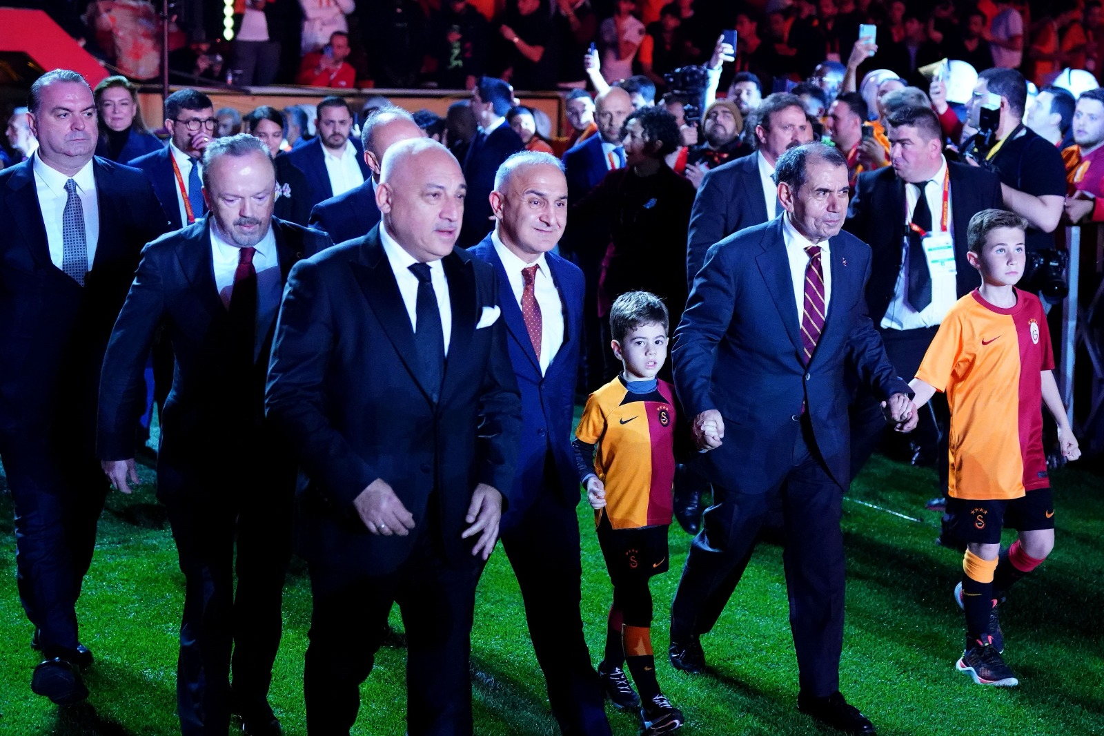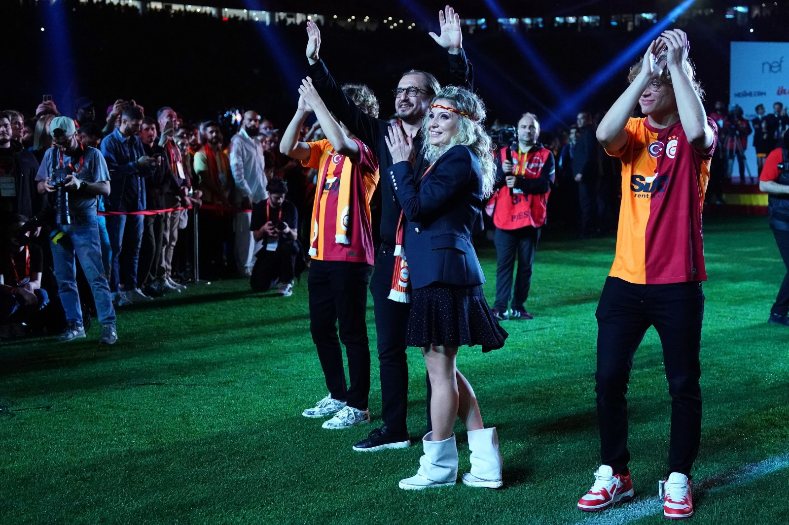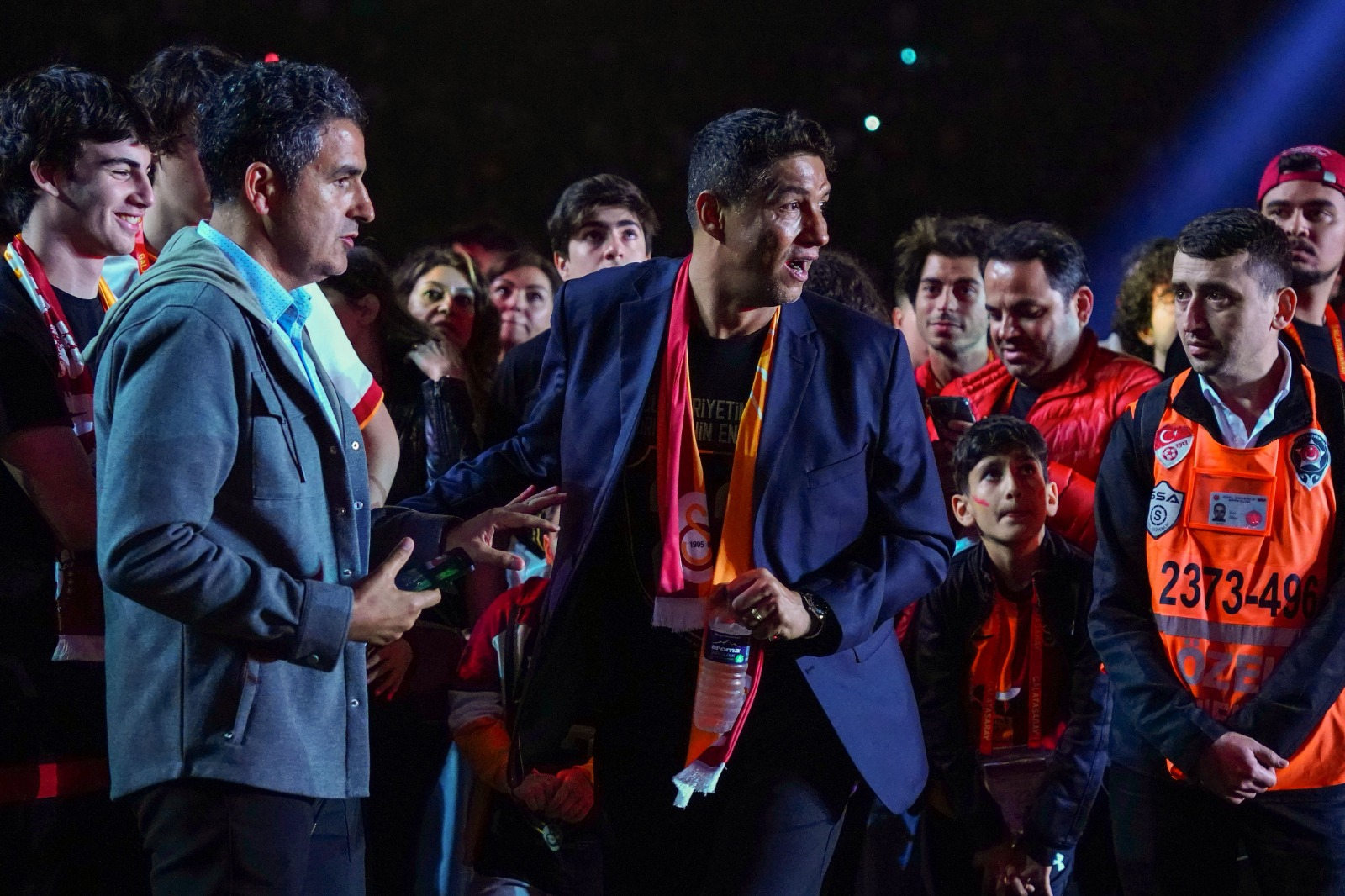 Galatasaray Başkanı Dursun Özbek, İkinci Başkan Metin Öztürk, Başkan Yardımcıları Niyazi Yelkencioğlu ile Cemal Özgörkey ve Sportif AŞ Başkan Vekili Erden Timur tek tek sahneye çıkarak, taraftarları selamladı.