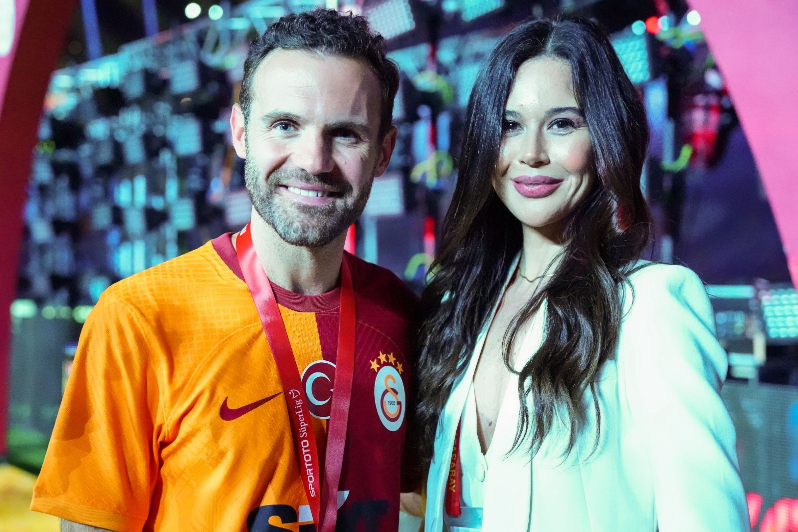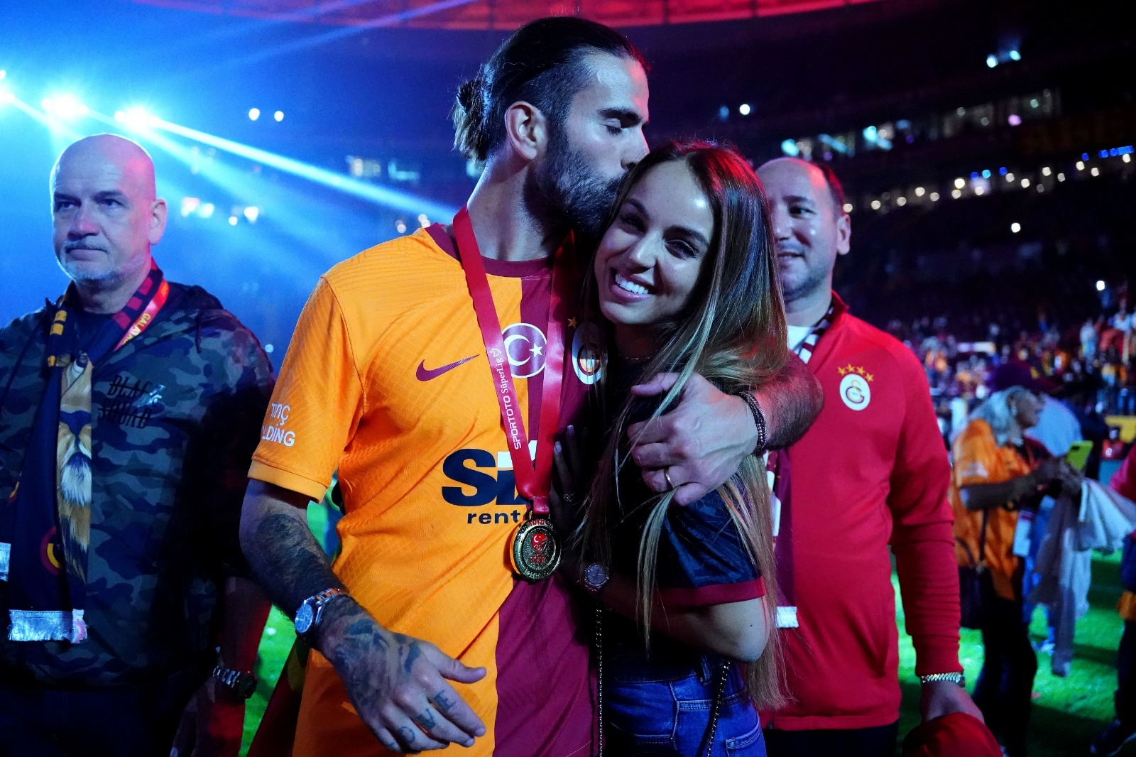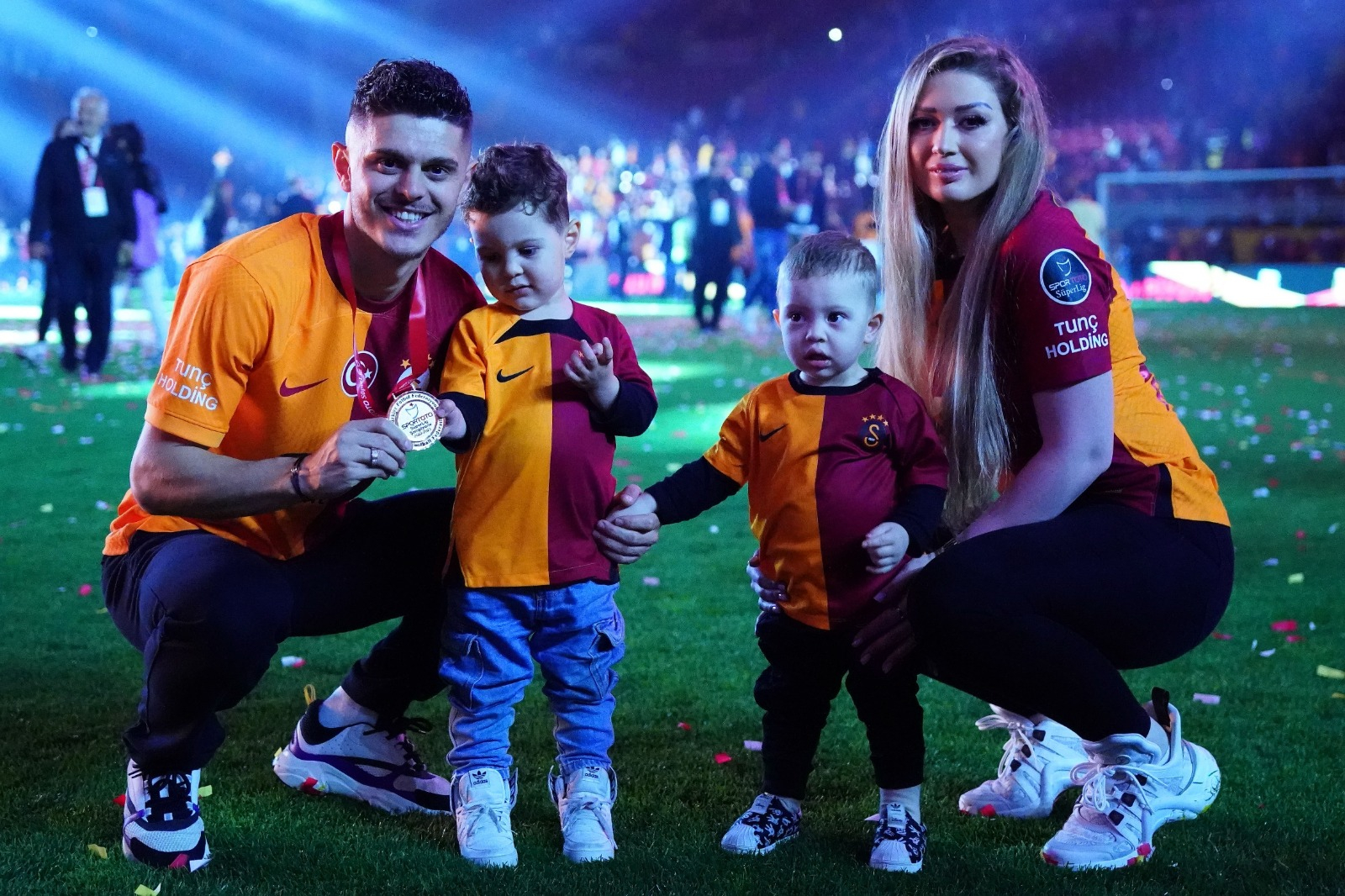 Galatasaray ile ilk sezonunda şampiyonluğu ulaşan Teknik Direktör Okan Buruk, kutlamalara eşi Nihan Buruk ve oğlu Ali Yiğit ile çıktı.