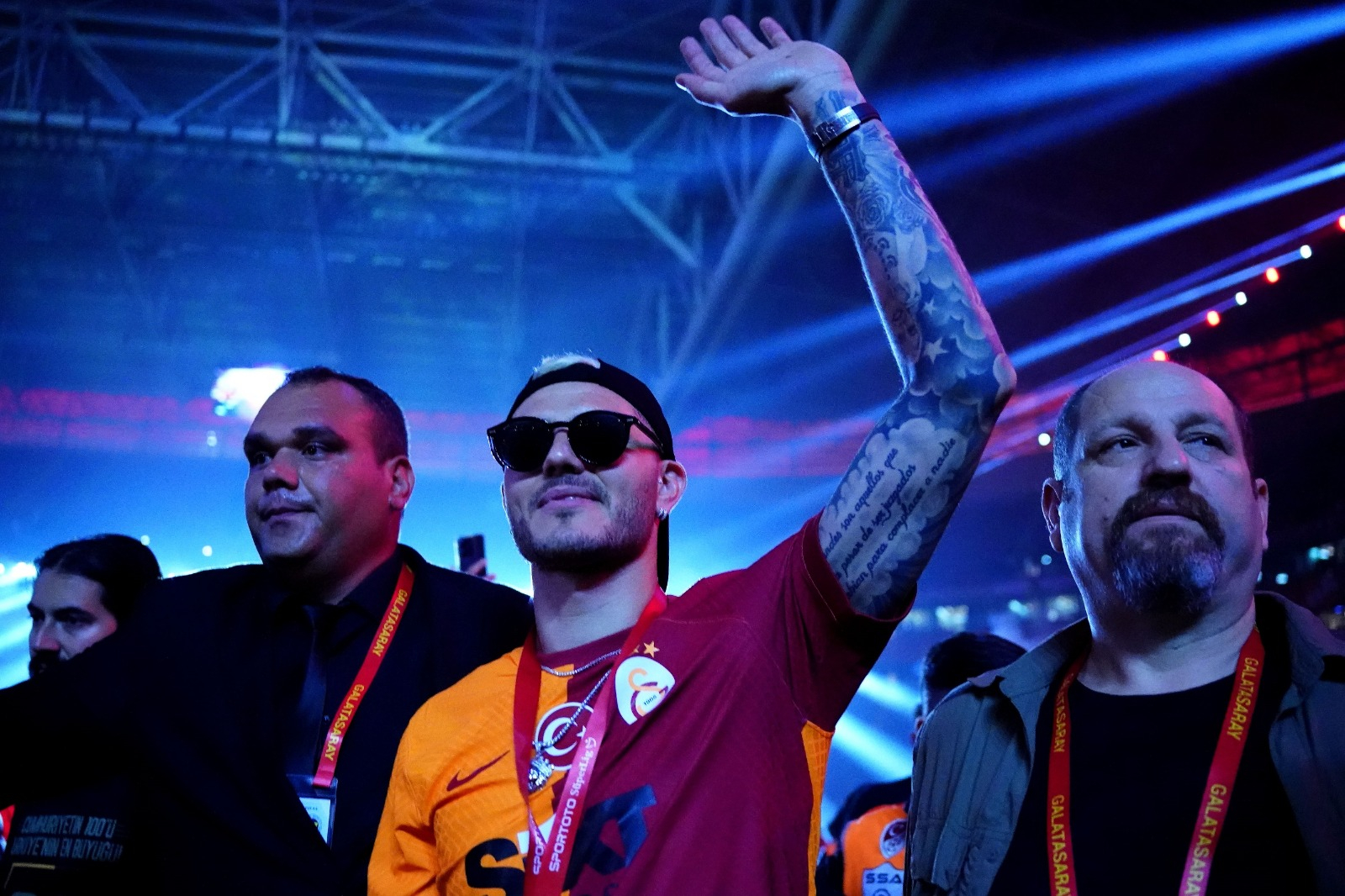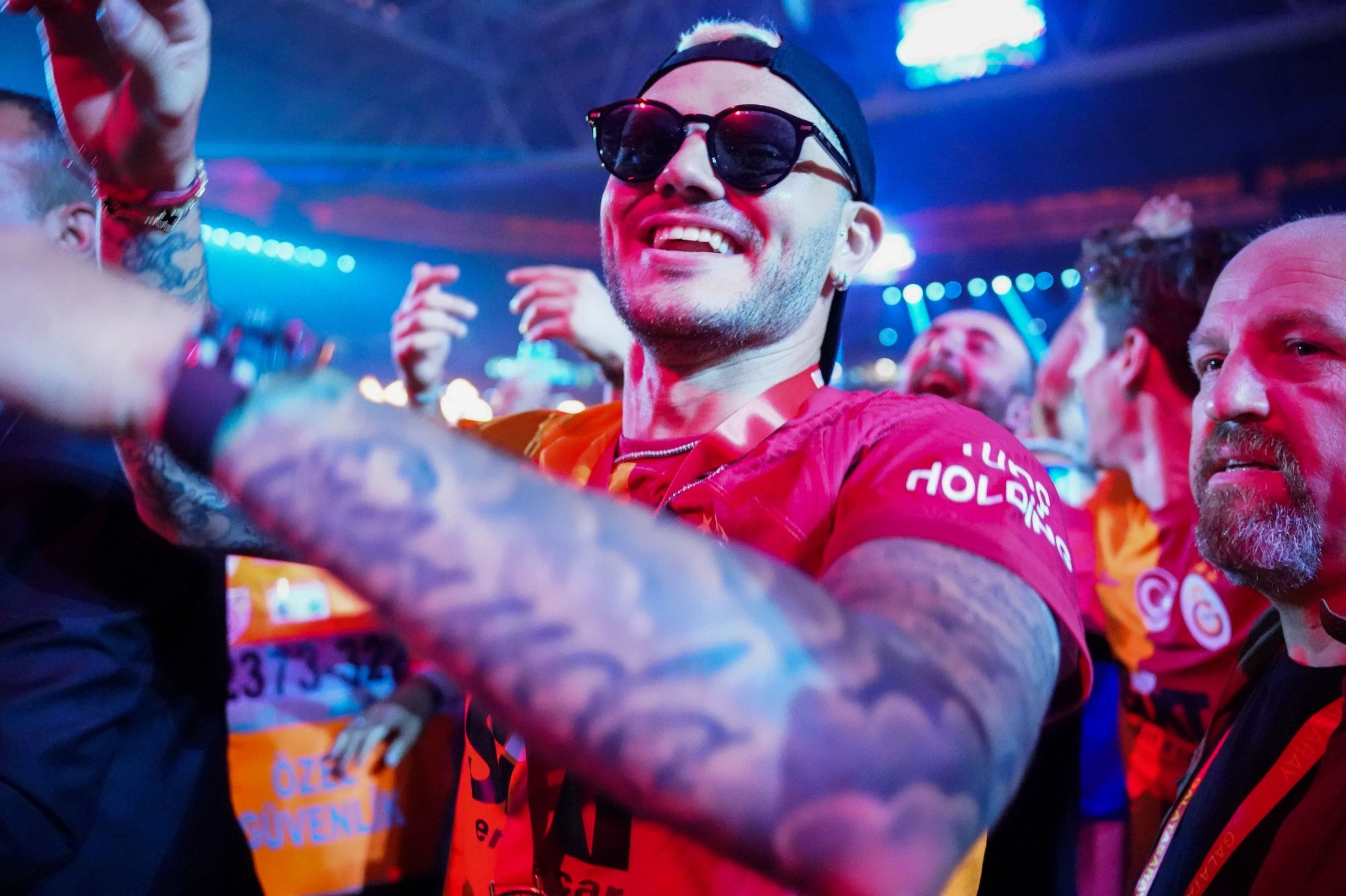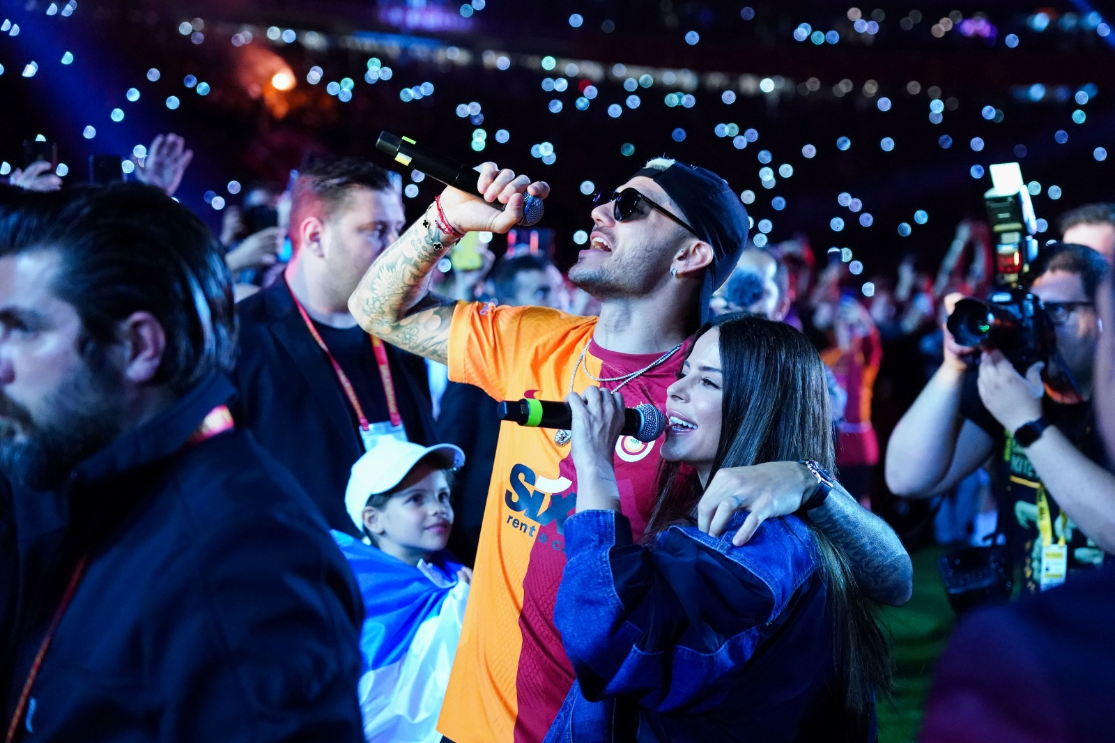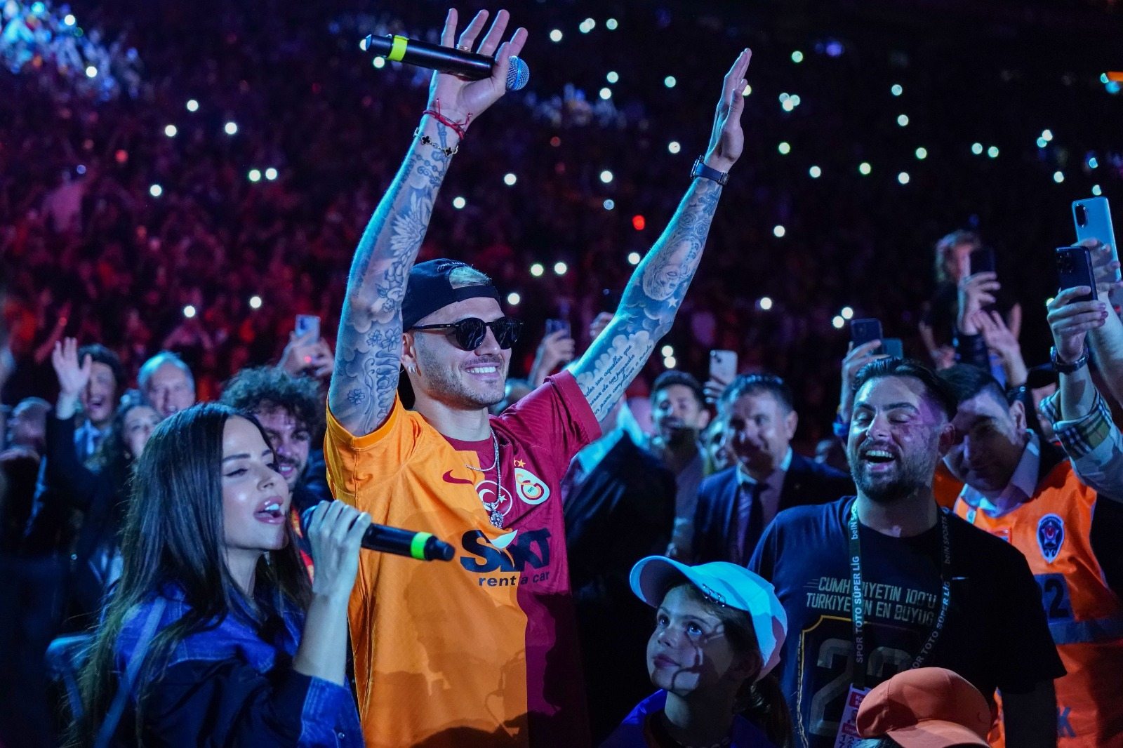 Şarkıcı Simge Sağın ile birlikte çıkan Icardi, şarkıyı da beraber söyledi. Taraftarlar da yıldız futbolcuya eşlik etti.