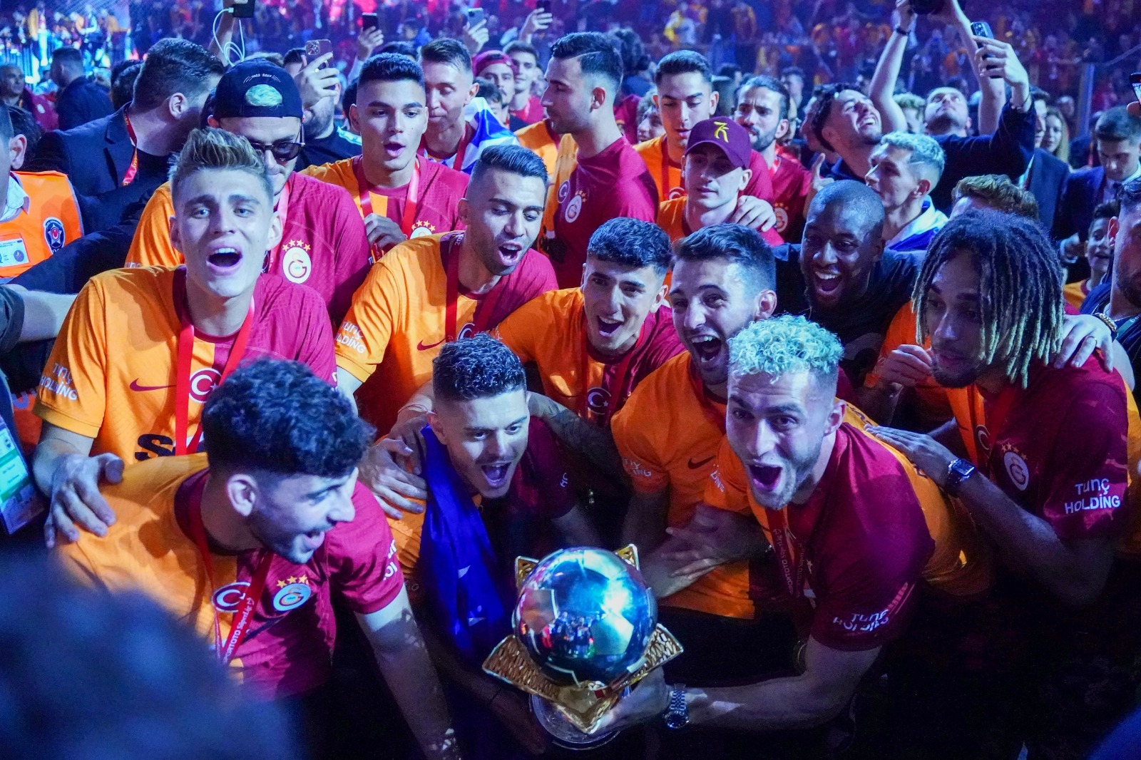 Sarı-kırmızılı futbolcular hep beraber kupayı havaya kaldırarak, büyük sevinç yaşadı.