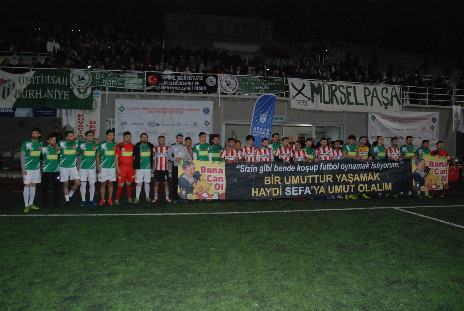 Final maçını oynayan iki takım da SMA hastası Sefa’ya yardım pankartı ile sahaya çıktı