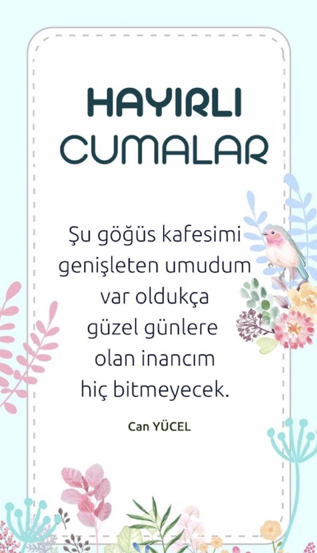 “Çıkarsa kalbinde yara, Yaradan dönüştürür bunu bir gün hayra, sen sabretmesini bilirsen; Yaradan düşürmez seni dara. Kaldır başını semaya, aç ellerini mevlaya. Sen istemesini bilirsen, mevla cevap verir duaya. Cuma günümüz mübarek olsun.”