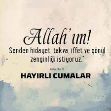 Allah'ım! Senden bu günün ve yarının bildiğim ve bilmediğim ne kadar hayır varsa hepsinden isterim. Senden cenneti ve cennete yaklaştıracak söz ve amelleri isterim. Cumanız mübarek olsun.