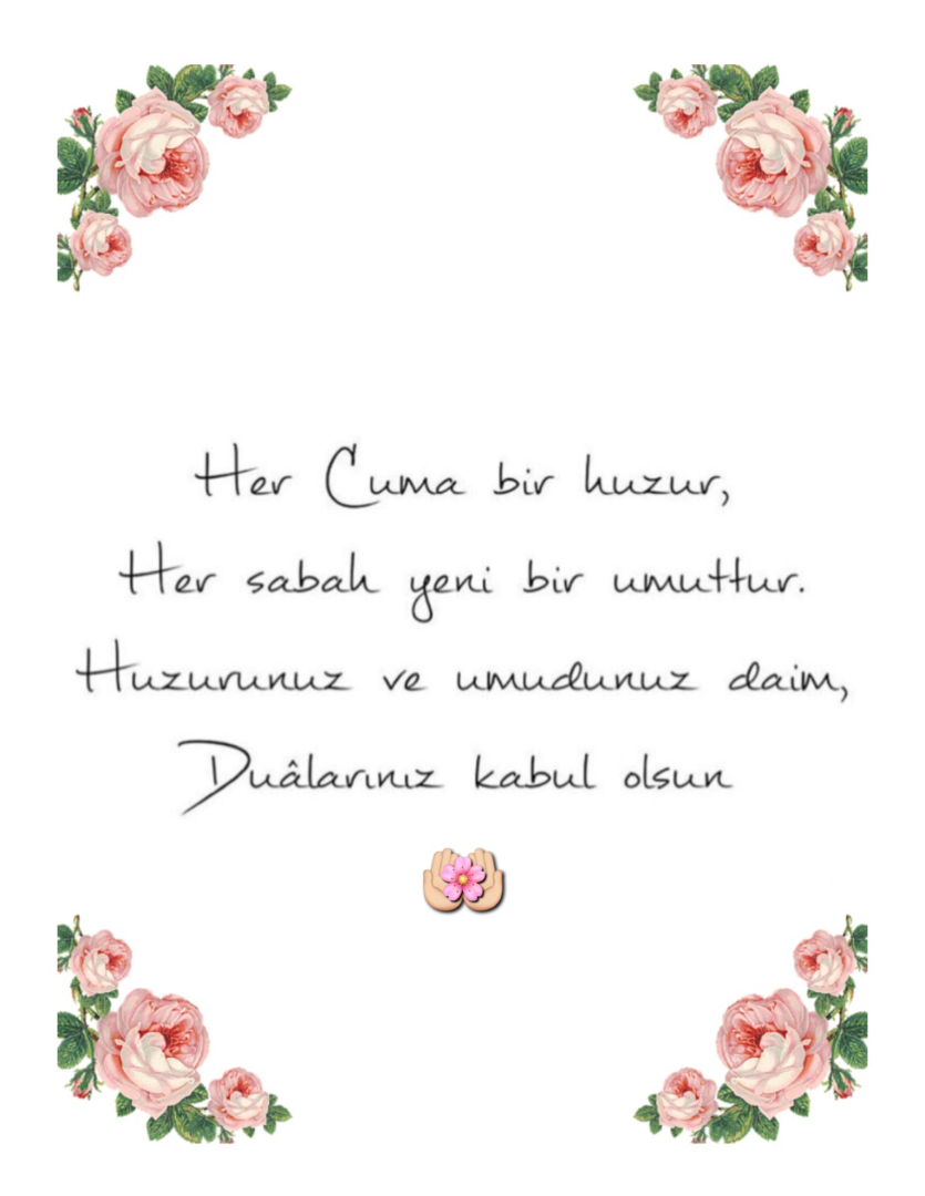 Ettiğiniz her dua derdinize deva, sağlığınıza şifa, gözünüze nur, gönlünüze huzur, Ailenize ve sevdiklerinize huzur getirsin. Hayırlı cumalar…