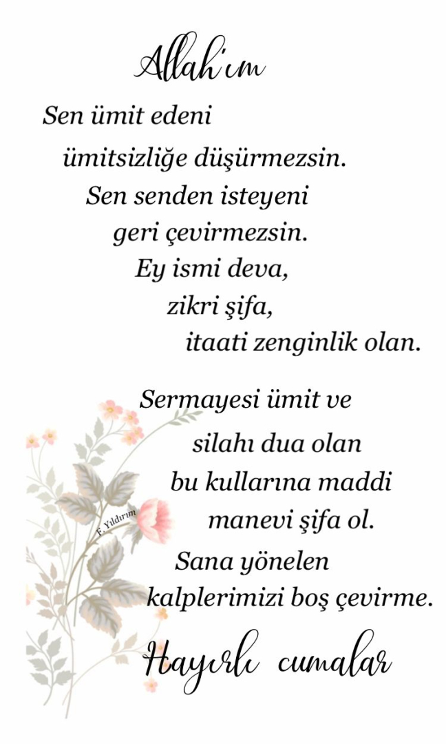 "Allah'ım! Dillere destan, yüreklere ferahlık olan merhametin ile günahlarımızı affeyle. Amin tüm Müslümanların cuması mübarek olsun. Hayırlı, bereketli, huzurlu ve sağlık dolu günler dilerim. "