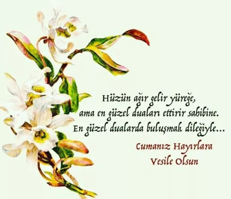 Ettiğin her dua derdine deva, sağlığına şifa, gözüne nur, gönlüne huzur, ailene ve sevdiklerine huzur getirsin. Hayırlı cumalar dilerim.