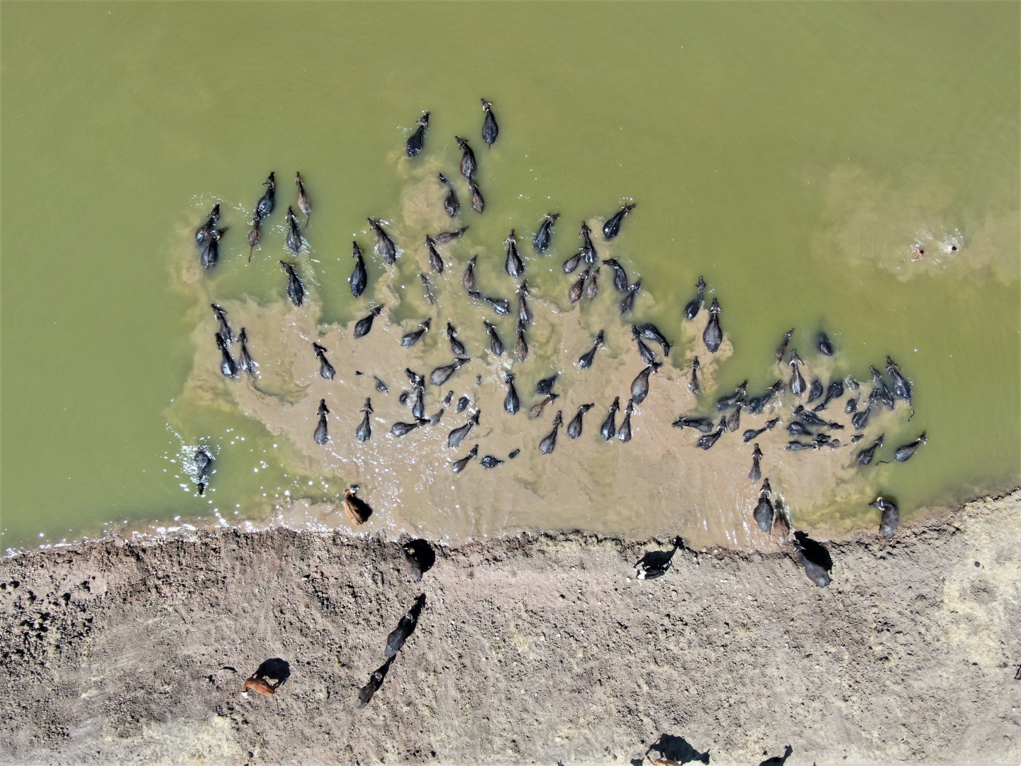 Diyarbakır'da Eyyam-ı Bahur sıcaklarından etkilenen mandaların serinlemek için göletlere girmesi dron ile havadan görüntülendi.