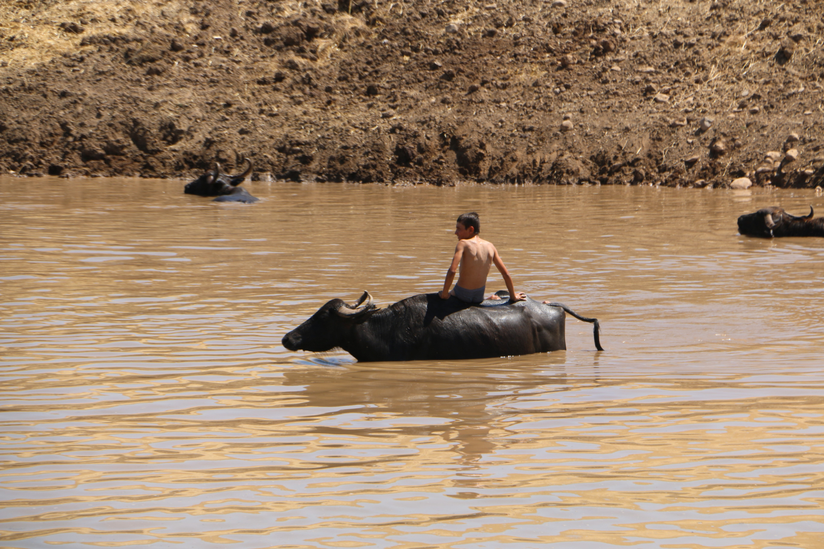 Diyarbakır’da mevsim normallerinin üzerinde seyreden hava sıcaklığı etkisini gün geçtikçe daha da artırıyor. Silvan ilçesine bağlı Bağdere kırsal Mahallesi'nde sıcaktan bunalan mandalar, çareyi Diyarbakır Büyükşehir Belediyesi Kırsal Hizmetler Daire Başkanlığı tarafından köye yapılan göletlere girip serinleyerek buluyor. Çobanlar ise mandaların kuyruğundan tutup sörf yaptı.
