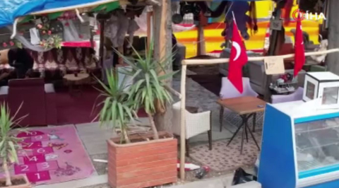 Bölgedeki enkazlardan toparladığı koltuk, masa, bayrak, fotoğraf, oyuncak gibi benzerleri ürünlerle kafe açan Yalçın, buraya gelen vatandaşlara hizmet veriyor.