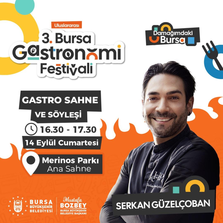 Bursa’nın sahip olduğu zengin mutfak kültürünü turizme kazandırmak ve dünyaya açmak amacıyla Büyükşehir Belediyesi tarafından ‘Damağımdaki Bursa’ temasıyla düzenlenecek olan 3. Gastronomi Festivali’ne 13-14-15 Eylül tarihlerinde Merinos Park ev sahipliği yapacak. Bu yıl uluslararası katılımla gerçekleşecek festival, konserler, yarışmalar, ünlü şeflerle söyleşiler gibi birbirinden renkli içerikleriyle Bursalılara unutulmaz bir deneyim yaşatacak. Bursa’nın duayen sanatçıları Müzeyyen Senar ve Zeki Müren’in isimlerinin verildiği çarşı alanlarında, ziyaretçiler hem göze hem de damaklara hitap eden tatları deneyimleme imkanı bulacak.